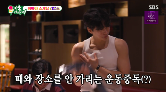 방송시청후작성된리뷰기사입니다.[OSEN=박하영기자]‘미운우리새끼’윤현민이생애첫소개팅중상의탈의를했다.26일방송된SBS예능‘미운우리새끼’(이하‘미우새’)에서는탁재훈과김희철이‘연애바보’임원희,윤현민을위해아바타소개팅에나서는모습이그려졌다.이날윤현민은“저는진짜소개팅을태어나서한번도해본적이없다.저는대학을안갔기때문에중,고등학교도남자학교고”라고소개팅하는이유를밝혔다.특히윤현민은“제가얼마전에사주를봤는데내년에결혼운이세게들어온다고하더라”라고고백해눈길을끌었다.이를본윤현민어머니는“제발”이라고했고,탁재훈은“아니현민이야사실허당이긴하지만그래도겉으로보면아무소리안하면허당인지모른다고한다.되도록이면말을하지마”라고조언했다.그러자윤현민어머니는과거윤현민영상이나오자“저방송나가고‘윤현민어머니세요?’하는데아니라고했다”라고털어놔웃음을자아냈다.소개팅을앞두고두사람은호감사인을정했다.임원희는코를만지고,윤현민은눈썹을만지기로했다.이윽고소개팅상대방으로서울에서빈티지의류매장을운영하고있다는남민주씨와골프수업을하고있는박윤정씨가등장했다.본격적으로탁재훈과김희철은지령을내리기시작했다.탁재훈은“제옷스타일이어떤지봐달라”고했고,임원희가그대로따라하자남민주는“봄의남자같다.요즘그런거유행이다.줄문의카라티랑트렌치느낌많이입으시더라”라고답했다.윤현민은탁재훈의지령을받아“두분다미인이시고,제스타일인것같다.오늘은두분중에저를누가차지할까요?”라고물었다.두여성분이빵터지자차태현은“원희형이했으면안터졌을수도있다”고말했다.한편,임원희는왼쪽코를만져남민주에호감을표시했고,윤현민은오른쪽눈썹을만지며박윤정에게호감을드러냈다.박윤정이잠시자리를비운사이,남민주가덥다며겉옷을벗자탁재훈은“저도좀더워서벗어도될까요?”라고지령을내렸다.당황한윤현민은결국자켓을벗으며근육질몸매를자랑했다.뜻밖의육체미과시속탁재훈은환풍기를뽑아서옆에서아령을하라고지령을내렸다.때와장소를가리지않고운동하는모습이연출되자윤현민어머니는“나시장다시는가지말아야지”라고반응해웃음을안겼다./mint1023/@osen.co.kr[사진]‘미운우리새끼’방송화면캡처Copyright©OSEN.무단전재및재배포금지.