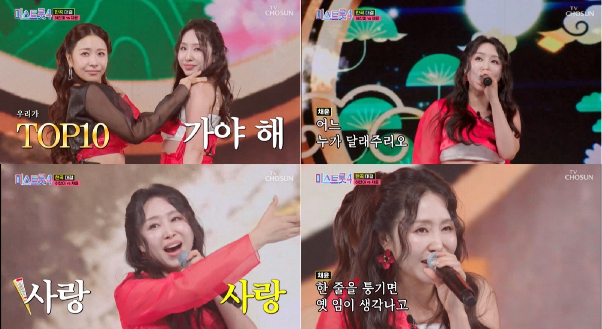 TV조선‘미스트롯4’가수채윤이‘미스트롯4’레전드미션‘한곡대결’에서노련미넘치는무대를선보이며시청자들의눈과귀를사로잡았다.채윤은지난12일방송이된TV조선‘미스트롯4’에출연해Top10이결정되는본선4차레전드미션‘한곡대결’에서가수허찬미와함께무대를꾸몄다.강렬한붉은색의상을입고등장한채윤은무대에앞서“그동안가수로활동했던내공이헛되지않게꼭Top10에진입하겠다”며당찬포부를밝혔다.두사람은김용임의‘열두줄’을선곡해무대를선보였다.가야금을연주하는듯한퍼포먼스로시작된무대는단번에시선을사로잡았다.채윤은발랄하면서도단단한보컬과센스넘치는퍼포먼스로무대를이끌며깊은인상을남겼다.김용임레전드는“어려운노래를불러주셔서너무고맙다.호흡과소리조절이모두필요한데그맛이제대로나온것같다”며두사람의무대를높이평가했다.1라운드투표결과아쉽게도높은점수를획득하지는못했지만,채윤은현역18년차의노련함이돋보이는완성도높은무대로시청자들에게존재감을각인시켰다.채윤은CJB(청주방송)‘전국TOP10가요쇼’MC,TV조선프로그램‘알콩달콩’고정리포터,‘알맹이’고정패널활동을비롯해,KBS‘전국노래자랑’,‘가요무대’,‘아침마당’,TV조선‘화요일은밤이좋아’등다수의방송프로그램에출연하며만능엔터테이너로서의입지를다져왔다.지난5월에는싱글‘불어라꽃바람’을발매하며활발한음악활동을펼치고있다.채윤이출연하는TV조선‘미스트롯4’는매주목요일오후10시에방영된다.손봉석기자[email protected]©스포츠경향.무단전재및재배포금지.