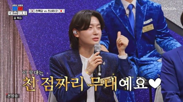 금타는금요일/사진=TVCHOSUN캡처[스포츠투데이정예원기자]'금타는금요일'김용빈이천록담을치켜세웠다.13일방송된TVCHOSUN예능'금타는금요일'에서는설특집으로한일데스매치가펼쳐졌다.먼저한국팀대장으론김연자가,일본팀대장으론타카하시요코가출격했다.요코는'잔혹한천사의테제''혼의루프란'을열창했다.다음대결은천록담과츠네히코였다.츠네히코는'런'(RUN)으로J-트로트의진수를보여주며98점을받았다.천록담은경기민요'배띄워라'를선곡,츠네히코에대항했다.천록담의무대가끝나자김용빈은"정말손발안가리고모든걸쏟아부으신거다.100점을넘어서는점수가나왔으면좋겠다"고바람을드러냈다.[스포츠투데이정예원기자[email protected]]Copyright©스포츠투데이.무단전재및재배포금지.
