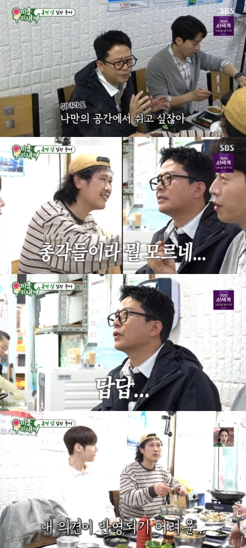 ‘미운우리새끼’사진|SBS김준호가외롭다고말했다.26일오후방송된SBS예능프로그램‘미운우리새끼’(이하‘미우새’)에는허경환의고향인통영에방문한김준호,육중완,최진혁의모습이보였다.이날방송에서김준호가“나만의공간에서쉬고싶다”라고말하자육중완은“결혼몇년차냐”라고물었다.이에김준호는“그게아니라뭔가아티스트로서감성을가지려면혼자만의시간이필요하다.요새개그가안된다”라고해명했다.육중완도“저도음악이안만들어진다”며공감했다.또김준호와육중완은외롭다고토로했다.총각들이결혼했는데왜외롭냐고묻자육중완은“늘자유롭게결정했는데이제는의견이내도안받아들여진다.아내가떡볶이랑순대를사오라고해서사갔는데혼났다.튀김이랑어묵을안사왔다고”라고말해좌중을폭소케했다.‘미운우리새끼’는일요일오후9시5분SBS에서방송된다.[서예지스타투데이객원기자]Copyright©스타투데이.무단전재,재배포및AI학습이용금지
