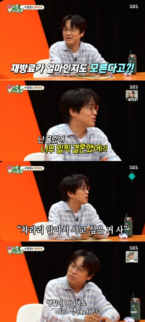 ‘미운우리새끼’사진|SBS차태현이돈관리를아내에게전부맡긴다고말했다.26일오후방송된SBS예능프로그램‘미운우리새끼’(이하‘미우새’)에는차태현이출연해화려한입담을자랑했다.이날방송에서차태현은아내에게돈관리를전부맡긴다면서본인재방료가얼마인지모른다고밝혔다.그러면서“많은분이그렇게안하더라.난몰랐다.내가너무일찍결혼했다.정보없이결혼한거다”라며아쉬움을토로했다.차태현은“카드를쓰면아내에게알림이가는데그게좀신경쓰인다.기념일에아내에게선물을했는데몇번바꿔오더라.그러면기분이좋지않으니까알아서사고싶은거사라고했다.생일이아니어도미리당겨서사더라”고말해웃음을안겼다.신동엽은“이건78세때생일선물”이라며상황극을해웃음을더했다.‘미운우리새끼’는일요일오후9시5분SBS에서방송된다.[서예지스타투데이객원기자]Copyright©스타투데이.무단전재,재배포및AI학습이용금지