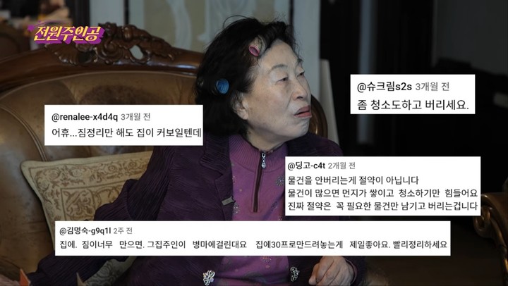 10년전달력까지보관…"내재산없어지는것같아"(MHN박선하기자)배우전원주의집에서300리터에달하는쓰레기가나오며눈길을끌었다.17일유튜브전원주_전원주인공채널에는'며느리와집정리했는데,쓰레기만300리터나온난리법석현장!'이라는제목의영상이업로드됐다.이날제작진은며느리를만나전원주의집정리를위해물건을버릴수있도록전원주를설득하게도와달라고요청했다.며느리는"어머니는물건을버리려고밖에내놓으면다시갖고들어가신다"면서"버려야정리가되는데,본인이어렵게사시고너무알뜰하시다보니안쓰고안버리는게몸에배신것"이라고말했다.결국전원주는제작진과며느리의설득끝에일부물건을정리하기로했다.10년전달력과종이부채,유통기한이지난사탕과비타민,고장난CD플레이어,오래된화장품과녹슨핀등이정리대상에올랐다.전원주는쓰던종이컵을버리려하자"씻어서쓰면된다"며만류하기도했다.하지만제작진은단호하게정리를이어갔다.물건이하나둘사라지자전원주는"내재산이없어지는것같다"라며아쉬운표정을지었다.청소를마치자전원주집에서는재활용1박스와종량제50리터4봉지양의쓰레기가나왔다.깨끗해진집안에서식사를하며전원주는"수고했다.좋다.애썼다"면서"앞으로는식탁에서밥먹을수있겠다"고며느리와제작진에게고마운마음을전했다.며느리는"정리된집안찍어서남편한테보내면깜짝놀랄것같다"면서"이제수납장에물건넣으시면되요"라고흐뭇해했다.한편,전원주는주식,금,서울신촌건물,청담동아파트등자산을보유하고있는것으로알려졌다.특히전원주는과거tvN'유퀴즈온더블록'에출연해SK하이닉스주식을2011년2만원대에주식을사서현재까지보유하고있다고밝혀주목을받기도했다.Copyright©MHN.무단전재및재배포금지.
