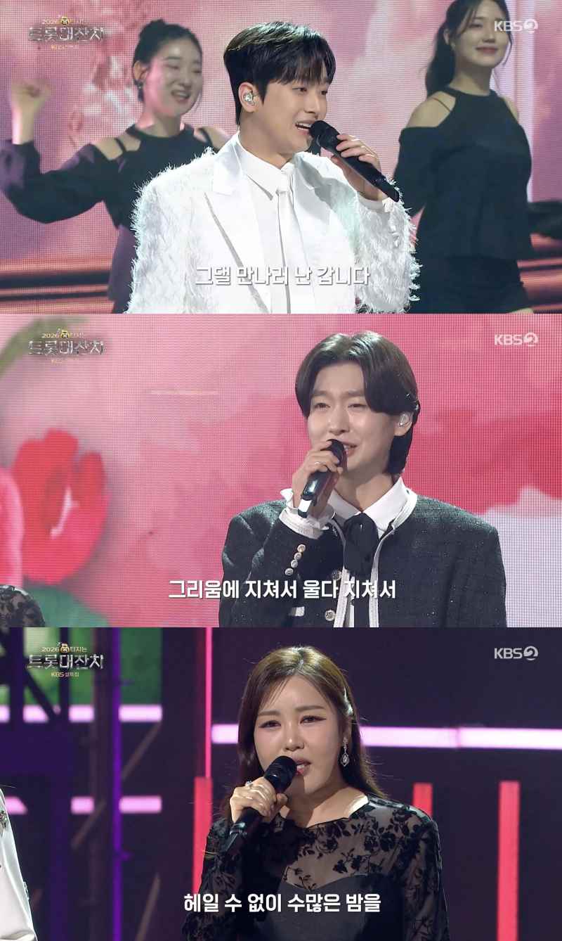 ⓒKBS2'2026복터지는트롯대잔치'[스포츠한국신영선기자]가수이찬원이'트롯대잔치'의문을열었다.17일방송된KBS2설특집'2026복터지는트롯대잔치'에서는MC이찬원의진행으로유명트로트가수들이총출동해설연휴를흥으로채웠다.줄타기,퍼포먼스메들리등그랜드오프닝에이어무대에오른이찬원은'그댈만나러갑니다'로본격적인'트롯대잔치'의막을열었다.올화이트슈트를입은이찬원은관객석의박수와함성을유도하며분위기를후끈달아오르게했다.단독MC를맡은그는"오늘이자리에함께해주신관객여러분뿐만아니라안방에서지켜보고계신시청자여러분들께복이가득차오르고복이팡팡터지는무대들로준비했다"고밝혔다.ⓒKBS2'2026복터지는트롯대잔치'이어'트롯대잔치'를함께할15명의가수들을소개했다.신유,송가인,박서진,김용빈,박혜신,김희진은'동백아가씨'를불렀고황민우,황민호,박성온,김소연은'파트너'로관객들에게첫인사를했다.박현빈,안성훈,나태주,김희재,박지현은박현빈의히트곡'샤방샤방'을함께부르며무대에등장해관객들의환호를받았다.한편이날'2026복터지는트롯대잔치'에는김연자,박현빈,신유,송가인,김용빈,박서진,안성훈,나태주,김희재,박지현,박혜신,김희진,황민우・황민호,김소연,박성온,남창동,션븨,독특크루등이출연한다.스포츠한국신영선기자[email protected]©스포츠한국.무단전재및재배포금지.