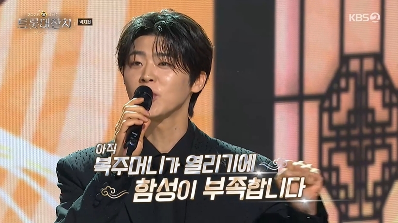 KBS2TV‘2026복터지는트롯대잔치’캡처KBS2TV‘2026복터지는트롯대잔치’캡처[뉴스엔김명미기자]박지현이신곡'애간장'무대를선보였다.2월17일방송된KBS2TV'2026복터지는트롯대잔치'(이하트롯대잔치)에서는대한민국대표트로트가수15인의무대가공개됐다.이찬원이MC로나선'트롯대잔치'는관객과함께호흡하며'복'을완성해가는특별한콘셉트로진행됐다.복주머니가하나씩열릴때마다선물처럼펼쳐지는다채로운무대들이설연휴안방에풍성한즐거움을전했다.이날박지현은신곡'애간장'무대를최초공개했다.박지현은오는23일오후6시각종음원사이트를통해첫정규앨범'MASTERVOICE'를발매한다.타이틀곡‘무(無)’를비롯해‘Opening’(오프닝),‘기도’,‘아름다운인생이야기’,‘DancingInLove’(댄싱인러브),‘안녕이란슬픈말’,‘애간장’,‘만물트럭’,‘초대장’,‘무(無)(inst.)’까지총10곡이수록되는가운데,박지현은'애간장'을열창해팬들을열광하게했다.무대후박지현은"곧나올제신곡이다.2월23일에발매되는신곡'애간장'많은사랑부탁드린다"고당부했다.뉴스엔김명미mms2@기사제보및보도자료[email protected]ⓒ뉴스엔.무단전재&재배포금지Copyright©뉴스엔.무단전재및재배포금지.