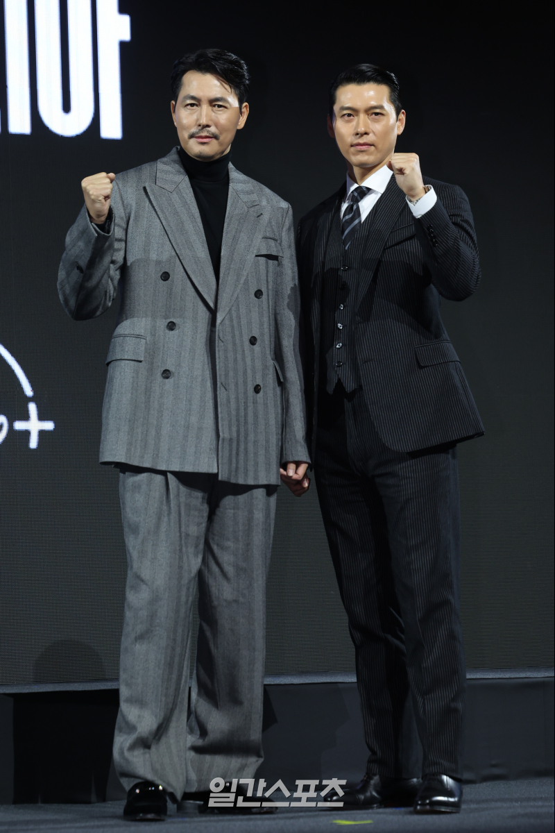 배우정우성,현빈이15일오전서울강남구그랜드인터컨티넨탈서울파르나스에서열린디즈니+오리지널'메이드인코리아'제작발표회에참석해포토타임을갖고있다.'메이드인코리아'는부와권력에대한야망을지닌남자와그를막기위해모든것을내던진검사,시대의소용돌이속펼쳐지는이야기.오는24일공개.서병수기자[email protected]/2025.12.15/현빈과정우성이‘메이드인코리아’를통해치열히대립한다.‘하얼빈’우민호감독과현빈의재회이자,정우성의사생활이슈후첫복귀작으로이목이쏠린다.15일오전서울강남구그랜드인터컨티넨탈서울파르나스에서디즈니플러스새시리즈‘메이드인코리아’제작발표회가진행됐다.이자리에는배우현빈,정우성,우도환,서은수,원지안,정성일,강길우,노재원,박용우와우민호감독이참석했다.‘메이드인코리아’는1970년대대한민국을배경으로,국가를수익모델로삼아부와권력의정점에오르려는사내백기태(현빈)와그를집념으로추적하는검사장건영(정우성)이시대를관통하는거대한사건들과직면하는이야기를그린다.이날우민호감독은“다른나라에비해우리특유의에너지가있는데,그것이어디서왔을까생각했을때전1970년이라고생각한다.당대를드라마로한번제대로만들어보려는욕심과욕망에서출발했다”고밝혔다.앞서우감독과‘하얼빈’으로호흡을맞춘현빈이백기태역을맡았다.극중백기태는은밀히움직이는중앙정보부과장으로,현빈은첫OTT드라마서보기드문야망의얼굴을꺼낸다.현빈은“시나리오를보고백기태의욕망이어디서부터나왔을지고민했다.개인적성공뿐아니라가족을지켜야하는가장으로서책임감도있다.많은감정과생각들이기태의욕망을키웠을것”이라고설명했다.‘하얼빈’에비해‘메이드인코리아’에선14~15kg증량도했다.현빈은“최고권력기관인중앙정보부의위압감이사람자체에보이길원했다.제가배우생활하면서가장큰몸을갖고있다”고말했다.배우현빈이15일오전서울강남구그랜드인터컨티넨탈서울파르나스에서열린디즈니+오리지널'메이드인코리아'제작발표회에참석해MC와토크를하고있다.'메이드인코리아'는부와권력에대한야망을지닌남자와그를막기위해모든것을내던진검사,시대의소용돌이속펼쳐지는이야기.오는24일공개.서병수기자[email protected]/2025.12.15/현빈과대립하는건집요한외골수검사장건영역의정우성이다.그는“(시나리오를)처음읽었을때상상력이용기있고,도발적이라고생각했다”며“이작품은실존사건속에가상의인물을두고완벽하게상상의이야기로끌고간다.그점이배우로서캐릭터를디자인하는데엄청난상상력을제공해줬다”고작업과정을밝혔다.지난해모델문가비아들의친부논란,이후여자친구와혼인신고등으로사생활이슈가불거진뒤첫복귀작인터,정우성은“작품을위해모인자리이기에제사적인변화에대해말씀드리지못하는점은양해부탁드린다”고조심스러워했다.대신현빈과호흡에대해그는“현빈이새로운캐릭터에도전했다.어떤모습으로현장에나타날까관찰하는재미가있었고,긴장도됐다”며“촬영이시작하면저도장건영으로서백기태를대하면서텐션이무르익어가는게느껴졌다”고기대를당부했다.배우정우성이15일오전서울강남구그랜드인터컨티넨탈서울파르나스에서열린디즈니+오리지널'메이드인코리아'제작발표회에참석해MC와토크를하고있다.'메이드인코리아'는부와권력에대한야망을지닌남자와그를막기위해모든것을내던진검사,시대의소용돌이속펼쳐지는이야기.오는24일공개.서병수기자[email protected]/2025.12.15/군상극답게엘리트장교이자기태의동생백기현역우도환을필두로조여정(배금지역),서은수(오예진역),원지안(이케다유지역),정성일(천석중역)등매력적인배우진이저마다욕망과개성을품은캐릭터를입는다.초호화캐스팅에대해우감독은운이좋았다며“배우들이시대의욕망과광기를시청자들에게전달할수있을것이라믿은게내연출의키(Key)”라고공을돌렸다.CG의도움을받는대신일본고베와태국을찾아고증을높힌1970년대부산과베트남모습,소품도볼거리다.우민호감독,배우박용우,노재원,강길우,정성일,원지안,서은수,우도환,정우성,현빈이15일오전서울강남구그랜드인터컨티넨탈서울파르나스에서열린디즈니+오리지널'메이드인코리아'제작발표회에참석해포토타임을갖고있다.'메이드인코리아'는부와권력에대한야망을지닌남자와그를막기위해모든것을내던진검사,시대의소용돌이속펼쳐지는이야기.오는24일공개.서병수기자[email protected]/2025.12.15/내년하반기공개를목표로시즌2도제작중이다.제작비가700억원이투입됐단설에대해우감독은“정확히말씀드리긴어렵지만시즌1과2를합친규모”라며“지금까지찍은작품중가장재밌게찍었다.내작품중제일재밌을것”이라고자신했다.한편‘메이드인코리아’는총6부작으로,오는12월24일과31일각각2회차씩공개한후매주수요일1개에피소드를추가공개한다.이주인기자[email protected]©일간스포츠.무단전재및재배포금지.