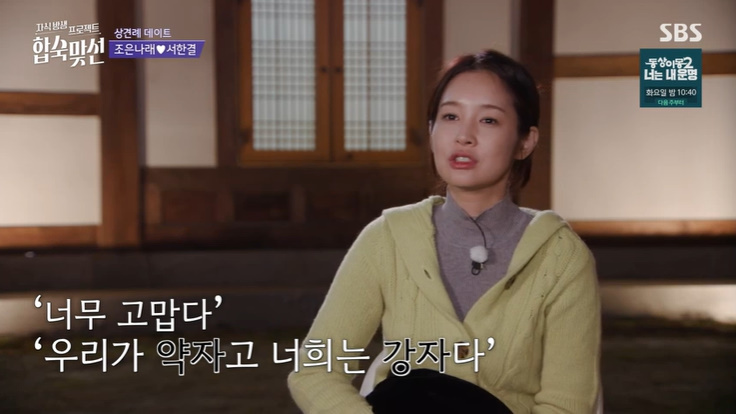 '합숙맞선'29일방송SBS'합숙맞선'캡처(서울=뉴스1)이지현기자=조은나래가어머니의언행에못마땅해했다.29일오후방송된SBS예능프로그램'합숙맞선'에서는상견례데이트가진행된가운데조은나래모녀(母女)가서한결모자(母子)와만났다.조은나래엄마는"너희둘그림이아주예쁘다"라며흡족해했다.내내밝게웃던그가"(서한결)어머니는보면속상할수있잖아"라고얘기했다.조은나래가왜그런말을하냐며툴툴댔다.조은나래엄마는"아무래도좀나이차이가나니까"라고걱정하는점을털어놨다.SBS'합숙맞선'캡처이때서한결어머니가도착했다.그는인터뷰에서"남자가선택했다고하더라.한결이성격상짧은시간에여러명보는것보다는'한명한테집중하기에도부족한시간이다'아마그랬을것같다.끌리는그대로선택을이어갔을것같다"라고예상했다.서한결엄마의예상대로양측이만났고,결혼에관한얘기도오갔다.특히조은나래엄마는당장결혼해도환영한다는말까지내뱉었다.옆에있던조은나래표정이안좋아졌다.그가인터뷰를통해속마음을고백했다."엄마가너무감동하더라.한결이가와준것에대해'정말고맙다','우리가약자고너희는강자다'이런느낌으로가니까"라며못마땅해했다.아울러"나이는나이고,난그런관계는애초에하고싶지않다.그렇게될관계를왜하냐?나도연하남못만나서안달난사람아니다"라고선을그었다[email protected]©뉴스1.Allrightsreserved.무단전재및재배포,AI학습이용금지.