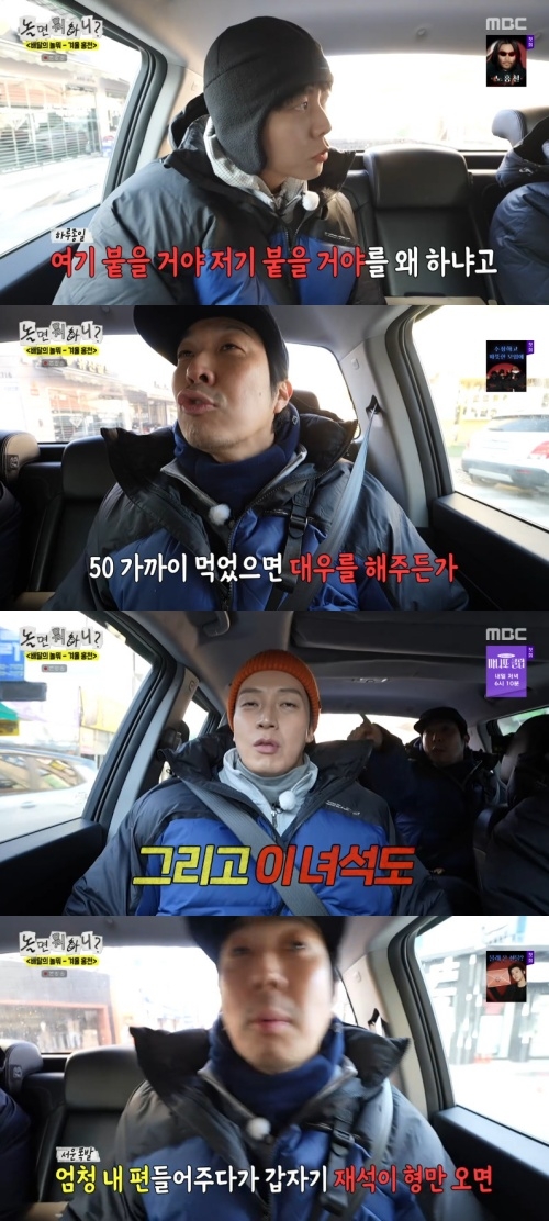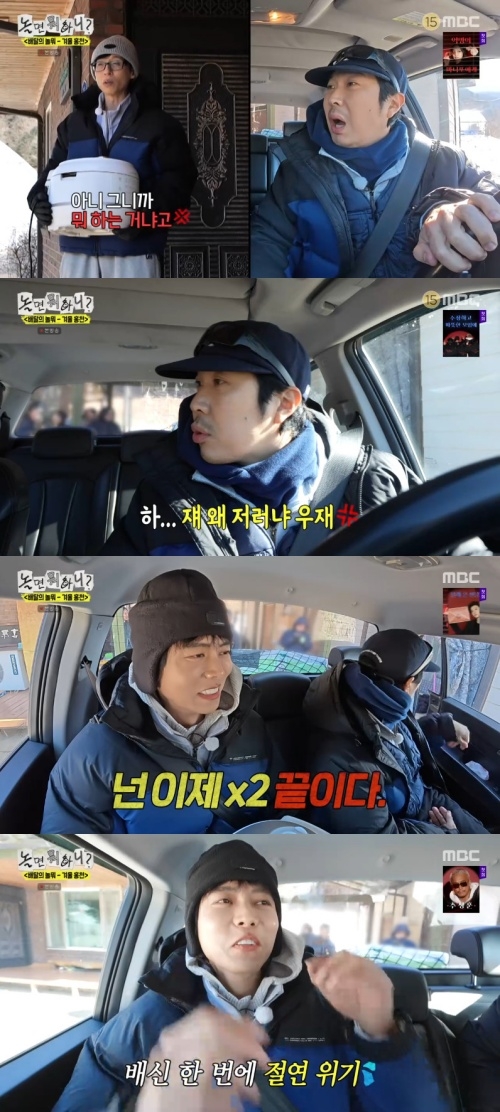 ‘놀면뭐하니’.사진IMBC하하가주우재를손절했다.31일오후방송된MBC예능프로그램‘놀면뭐하니?’(연출김진용장우성장효종왕종석,작가최혜정)는홍천가족을다시한번찾은멤버들이모습을보였다.이날방송에서마을회관으로이동하던중먼저차에탑승한하하는주우재와허경환에게“뛰어오게할까?”고제안했다.주우재는“그럴까형?문잠가”라며동조했고세사람은급하게차를운전해장소를빠져나가려고했다.그러나때마침밖으로나온유재석이도주광경을목격,하하는“타요!빨리타요!”라며아무일도없었던척했다.유재석이“뭐야?너뭐하는거냐고?”라며어이없어했고주우재는유재석에게다가가“아니하하형이재석이형두고도망가자고”라고고자질했다.하하는“쟤왜저러냐주우재진짜?”라며유재석에게운전석을양보했다.주우재가“이런거하지맙시다.동생들불편합니다”라며선을긋자하하는“넌이제끝이다.잘가라.진짜끝이다.자기도신나서했으면서엄청나게웃으면서했으면서”라며정색했다.유재석은“우재가이런걸싫어하더라.이런거하면끝까지안한다”고주우재편을들기도.그러면서“하하가자기편이없다.네가경험에비해서생각이짧다”고한방먹였다.하하는“진짜스트레스받는다”라며한숨을쉬었다.MBC‘놀면뭐하니?’는매주토요일오후6시30분방송된다.[서예지스타투데이객원기자]Copyright©스타투데이.무단전재,재배포및AI학습이용금지