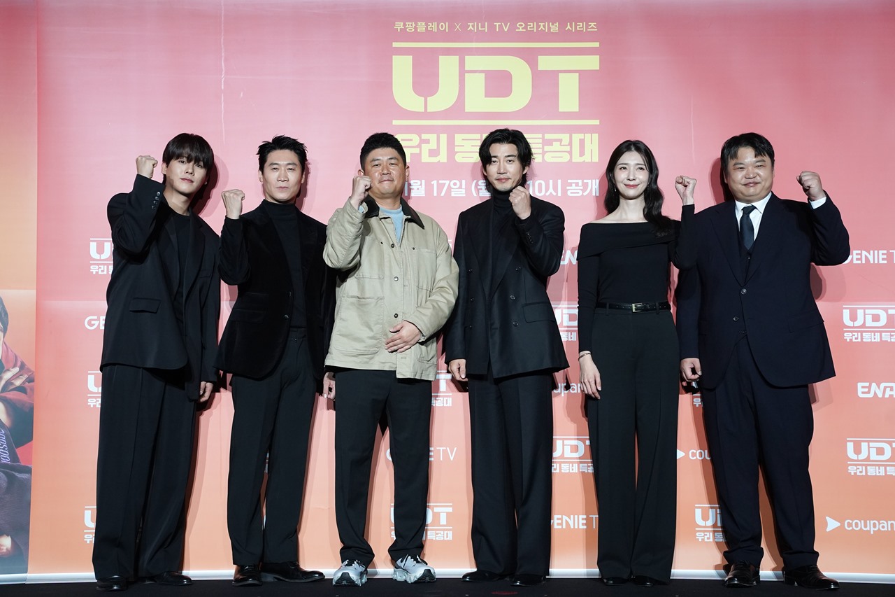 ⓒ쿠팡플레이[스포츠한국모신정기자]'범죄도시'1편의윤계상과진선규그리고'범죄도시'3편의고규필이쿠팡플레이신작'UDT:우리동네특공대'에서운명같은케미를펼친다.이번에는범죄물이아닌코믹액션드라마다.윤계상,진선규,고규필,김지현,이정하가주연을맡은쿠팡플레이X지니TV오리지널시리즈10부작'UDT:우리동네특공대'가17일첫방송을앞두고17일오후2시서울광진구풀만앰배서더서울이스트폴에서제작발표회를개최했다.이날제작발표회에는주연배우인윤계상,진선규,고규필,김지현,이정하와연출을맡은조웅감독이참석했다.'UDT:우리동네특공대'는나라를지키기위해서도아니고,지구평화엔더더욱관심없는,오직내가족과우리동네를위해뭉친예비역특공대의유쾌하고짜릿한이야기를그렸다.특작부대요원출신의보험조사관최강역을,진선규는극중기술병출신의동네청년회장곽병남역을,김지현은특임대조교이자마트사장인정남연역을맡았다.고규필이사이버작전병이자체육관장이용희역을,이정하가박격포병이자엘리트공대생인박정환역을연기했다.조웅감독은이날제작발표회에서주연배우들의캐스팅과관련"우리드라마는캐릭터의궁합이중요했던드라마다.사건이발생하면서사건적으로만따라가는드라마가아니라인물들의부딪힘으로긴장감을줘야했다.윤계상,진선규,김지현,고규필,이정하등다섯분뿐만아니라빌런으로출연하는배우들까지최강조합으로캐스팅이잘완성됐다"고밝혔다.ⓒ쿠팡플레이이어각주연배우캐스팅이유에대해"윤계상배우는따뜻한웃음뒤에차가움이있다.그런모습이최강과맞을것이라고생각했다.진선규선배님은예전에제작품을잠깐도와주신적이있는데따뜻함과유머가너무좋았다.김지현씨와도작품을한번했었는데차갑고도회적부분이세고너무잘한다.반면공연을보면코믹감과따뜻함도있다.그런면때문에제안을드렸다.고규필은사적으로알고있는데장점을더드러내주고싶었다.이정하배우는'무빙'을봤는데공대생이지만순수함보일수있는인물이라고생각했다"고밝혔다.조웅감독은가장재미있는장면을꼽아달라는MC박경림의질문에"딱한장면을꼽기보다인물들이붙으면붙을수록재미있어진다.1회떄는한분씩소개되다가인물이만나고또만나고하면서만날때마다케미가달라진다.회가거듭될수록더재미있어지실거다"라고말했다.'UDT:우리동네특공대'가생활밀착형액션을주되게선보이는것에대해"전직특수부대출신들이모여있기에최강의찐액션도있지만특수부대의물품이없는상황아닌가.실생활에놓인물건들이곽병남의아이디어와함께발전돼서만들어지는웃음이있는액션도있고멋있는액션들도나온다.웃기지만멋있다"라고밝혔다.극중등장하는사건들이시청자들에게얼마나현실감있게다가갈수있겠느냐는한취재진의질문에조감독은"살다보면현실속에서도예상치못하는일들이벌어지기도하지않나.우리작품에서는큰사건이벌어진다고해서인물들까지그사건을큰규모로해결하는것이아니라동네를지키는소시민적방식으로해결해낸다.사건들이이질감으로다가가거나낯설게다가가지는않을것이다.공감대몰입도높이기위해연출에서도신경썼다"고말했다.특작부대요원출신이자보험조사관인최강역을맡아최강의코믹액션을선보이게된윤계상은"이번작품에출연하게된여러가지이유가있다.처음에더늙기전에액션을해보고싶다는마음이있었다.최강역에그런모습들이있었다.이번에기회가찾아왔다고생각했다.최강은이중적캐릭터다.평상시보이는모습과위기상황에처했을때본캐가나오는데그런면이매력적으로다가왔다"고말했다.윤계상은이어최강역을소화한소감에대해"이번드라마에액션신이너무많았다.2부에가장큰액션이나온다.내일방송된다.이번액션을해내면서아직액션을더할수있겠다.액션할수있는나이가더남았다는것을느꼈다"고말했다.윤계상은영화'범죄도시'1편이후8년만에진선규와호흡을이루게된소감에대해"선규형과8년만에이번작품으로만났다.이번에더완벽한호흡을이뤘다.진선규형을너무사랑하고좋아한다.그것떄문에호흡이좋은건지운명적으로좋은건지모르겠다"며"형과제가평소에도농담을잘하면서노는데그느낌이고스란히들어가있다.연기를하는건지노는건지헛갈릴정도였다"고말했다.ⓒ쿠팡플레이기술병출신의동네청년회장곽병남역을맡은진선규는윤계상과8년만에호흡을이룬소감에대해"윤계상과운명같은케미를이뤘다.소떡소떡같은케미다.생김새는다르지만묘한케미다.잘안어울릴것같은데한입베어물면소지지의육즙과떡의쫄깃함이어우러지지않나.극중윤계상과이룬호흡이그랬다"고말했다.진선규는이어"어느작품을해도호흡이좋았다고말을하지만이번작품은특히캐릭터에대해저혼자고민하는것이아니고(크랭크인)한달반정도전에모여서리딩하고연습하고'범죄도시'때와똑같이그렇게호흡을이뤘다.현장에서'왜이렇게호흡이좋지?'하는느낌이들정도로다들열심히촬영했다.'범죄도시'때는제가장첸밑에있었는데이제는청년회장으로서동등하다"며너스레를떨었다.진선규는곽병남역을소화한소감에대해"제가가진약간의착한느낌같은것보다테토남적느낌을많이보여드리기위해서수염도안나는것을붙이기도하