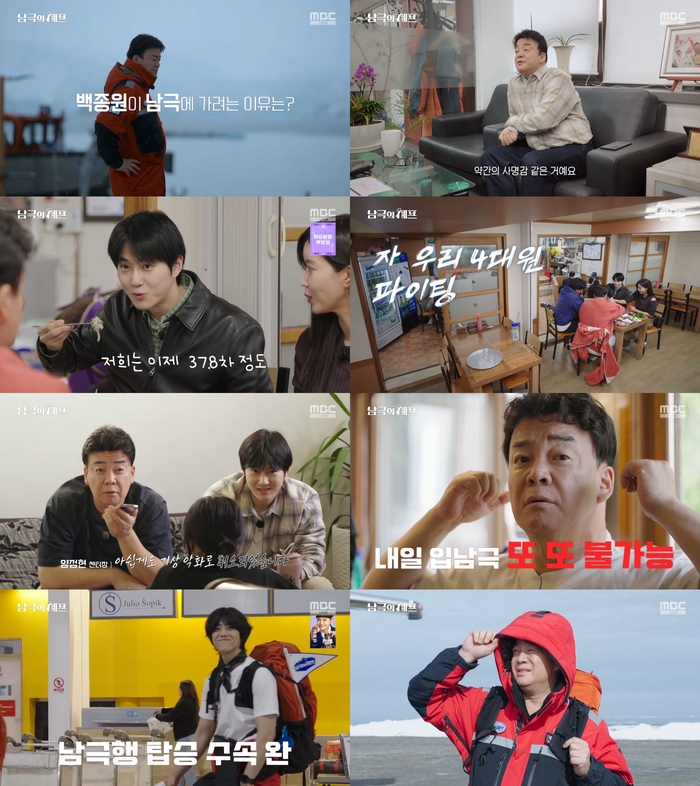 ‘남극의셰프’.사진IMBC‘남극의셰프’방송캡처요리연구가겸기업인백종원이임수향,수호,채종협과남극에발을디뎠다.17일방송된MBC‘남극의셰프’에서는남극으로떠난백종원,임수향,수호,채종협의모습이그려졌다.이날백종원은‘남극에가려는이유가무엇이냐’는질문에“지금진짜로기후가심각하다.이번여름에깜짝놀랐다”고입을열었다.이어“남극은기후변화의제일시작이지않냐.그걸연구하기위해가있는사람들이힘들게잘버텨주고있는데내가뭘해줄수있을까싶었다.약간의사명감같은게있다”고털어놨다.백종원은대원의자격으로펭귄마을,세종기지등국가의허락을받은구역을방문할예정이라고.이에백종원은“괜히진지해진다.사실부담은있었다”고고백했다.백종원과남극에가게될대원은임수향,수호,채종협이었다.이들은남극으로떠나기전해상안전훈련,소방안전훈련,육상안전훈련등을받으며만반의준비를했다.백종원,임수향,수호,채종협은한국을떠나스페인마드리드를거쳐칠레산티아고에도착했다.그러나31시간의고된비행에도2번의비행이남아있었다.칠레국내선을타고푼타아레나스에도착한백종원,임수향,수호,채종협은남극협력센터장을만났다.수호가“남극은언제갈수있냐”고묻자센터장은“남극들어가기전날저녁8시에서12시쯤내일비행기가들어간다,안들어간다이렇게통보가될거다”라고설명했다.입남극통보에따라대기가발생할수있다고.다음날저녁,백종원,임수향,수호,채종협은센터장의연락을기다리며초조함을감추지못했다.이후센터장은킹조지섬기상악화로입남극행비행편이취소됐다는소식을전했다.그리고다시찾아온저녁.채종협은“오늘은느낌이상당히좋다”고기대했다.그러나또입남극이불가능하다는소식이전해졌고,수호는“깜짝카메라인줄알았다.머리가많이복잡해졌다”고심란해했다.입남극불가소식이이어지자백종원은“첫날취소됐다고해서그럴수있다고생각했는데둘째날은말이안된다고생각했다.그런데셋째날까지안된다고해서리얼이구나싶었다.못들어가면어떡하지싶었다”고걱정을드러냈다.백종원,임수향,수호,채종협은한국출발부터6일동안의기다림끝에입남극을허가받았다.남극에발을내디딘임수향은“경이로운마음이있었다.이지구의가장끝에와있다니.벅찬마음이들었던것같다”고감격했다.백종원역시“선택받은사람만이들어올수있는느낌이었다”고이야기했다.[이세빈스타투데이객원기자]Copyright©스타투데이.무단전재,재배포및AI학습이용금지