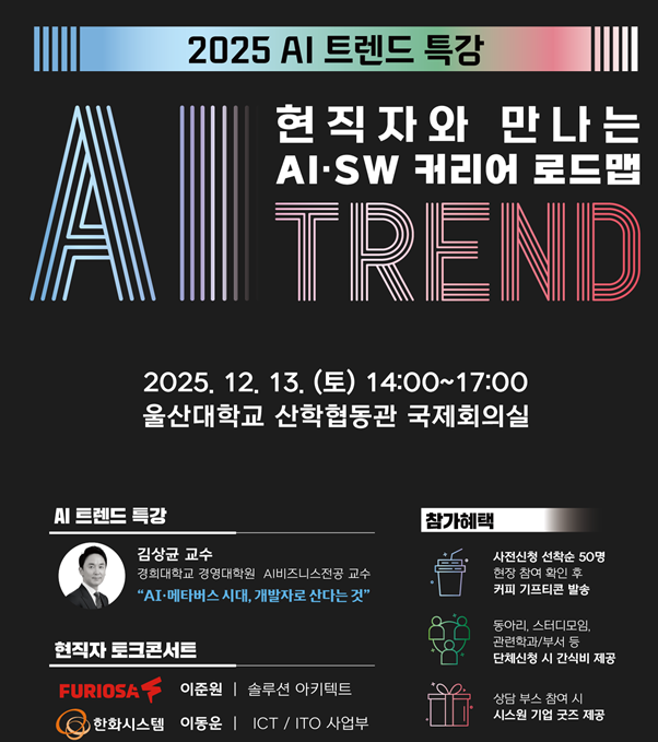 재단법인미래와소프트웨어(이사장이상훈)가주최하고,이티에듀와에듀플러스가주관하는‘2025AI트렌드특강’이오는12월13일울산대에서열린다.인공지능(AI)과소프트웨어(SW)분야의가장최신트렌드와생생한현장스토리를현직전문가들이직접들려주는기회로,울산지역대학생과취업준비생,이직준비자와현직자를대상으로열리는이번특강은시스원,울산대,울산대SW중심대학사업단,울산창조경제혁신센터,울산정보산업진흥원등이후원한다.조만간도래될AX시대의산업전반에필요한실무형인재수요가늘어남에따라SW·AI트렌드를공유하고,지역별인재성장을위한기반을마련하기위해기획된금번특강에는김상균경희대교수가‘AI&메타버스시대,개발자로산다는것’을주제로강연의포문을연다.AI와메타버스가교차하는시대에개발자가나아갈방향과최신IT트렌드와산업변화를분석하고,미래대비를위한개발자커리어생존전략을제시한다.현직자토크콘서트도이어진다.최근AI반도체시장을선도하는퓨리오사AI재직중인이준원이사와스마트인프라·융합IT기술을선도하는한화시스템ICT의이동운프로가직접연사로나선다.전문가들은실무경험,커리어전환과정,기술트렌드를기반으로특강참가자들에게실제현업에서느끼는변화와진로방향을생생하게전달할전망이다.지난11월7일진행된부산대특강에서는AI산업의흐름을이해하려는대학생,커리어방향을고민하는취업준비생들의질문이끊이지않았다.김교수와퓨리오사AI현직자특강이후에는연사들에게개별질문을이어가기도했다.이번울산대특강은이러한관심을이어받아,지역청년과취업준비생에게실질적인커리어인사이트를전할예정이다.강연과특강외에도현장에서는2026년시스원공채부스도함께운영하여채용및진로상담도함께열린다.개발파트,TA파트,AI파트,엔지니어파트등부서별채용정보도현장에서제공한다.현업에있는선배들이직접IT,SW,AI분야채용과진로상담에나서면서참가자들의관심도도올라갈것으로기대된다.박용성기자[email protected]©디지털타임스.무단전재및재배포금지.