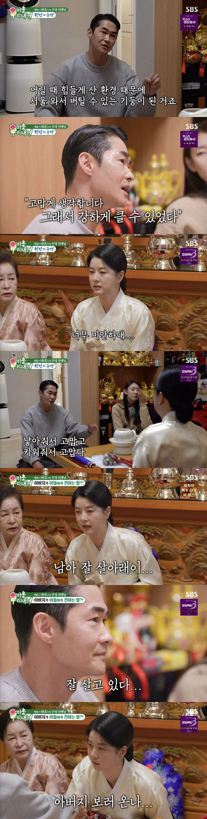 [SBS연예뉴스|김효정에디터]배정남이아버지의위로를받았다.16일방송된SBS'미운우리새끼'(이하'미우새')에서는배정남이한혜진과함께영화'파묘'의자문의원인무당을만나러갔다.이날무당은한혜진에대해곧결혼할운이있다며"미래의사람을만나는데연하에인연이있다"라고말해눈길을끌었다.그리고내년에사고수가있다며건강을잃을수있으니조심하라고일렀다.특히집정원에손댈곳이있어도손을대면안된다며"우물도파지말고돌같은거놓지말고문도새로놓지마"라고경고했다.이에배정남은액운을막기위해굿을하면되지않냐고물었다.그러자무당은"굿을해도안되고부적을붙여도안된다.내년까지는그냥내버려둬라.그리고나가는삼재에건드려라"라고당부했다.이어무당은힘든유년시절을보낸배정남을안타까워했다.이에배정남은"제일힘들었던게중학교시절이다.부모도없고아무것도없고내일도없고꿈도없었다.그때는너무외톨이였고사춘기까지겹치면서외로움이절정이었다.이렇게살아서뭐하나이런마음이었다"라며막막한현실을홀로감내해야했던당시를떠올렸다.하지만그는"참고생많이하고살았다.그래서이제웬만하게힘든건괜찮다.그렇게어려웠던환경때문에버틸수있었다.그래서이제는오히려고맙게생각한다.그래서강하게클수있었던것같다"라고말해눈길을끌었다.그런데이때무당은갑자기목소리를바꾸며배정남을향해"아버지산소에왜이렇게안오시냐"라고물었다.이에배정남은힘든시기에외면했던친척들과다남이되어버렸는데아버지산소에가면친척들을만날수밖에없다며아버지장례를치른후발길을끊을수밖에없었음을고백했다.이를들은무당은갑자기노래를시작했다.그리고그는"아버지가노래하신다"라며"우리아들이너무보고싶었대,너무미안하대"라고배정남의아버지를대신해마음을전했다.이에배정남은"미안한거없고낳아줘서고맙고키워줘서고맙다.낳아줘서내가있는것이지않냐"라며아버지를위로했다.그러자무당은"근데얘야니잘살아래,남아잘살아래이"라며배정남에게악수를청했다.그리고그는"남아아버지보러온나"라며다시한번강조했다.배정남은"잘있어라.걱정하지말고.푹쉬어.괜찮다"라며자신을걱정하는아버지에게진심을건네눈길을끌었다.Copyright©CopyrightⓒSBS.Allrightsreserved.무단전재,재배포및AI학습이용금지
