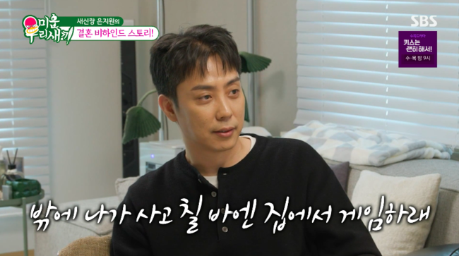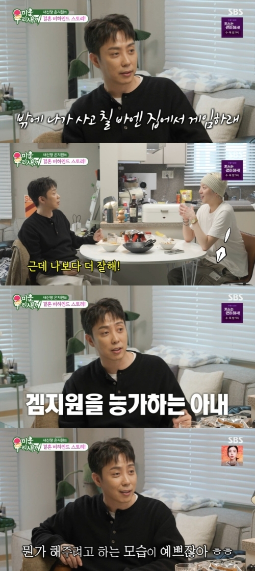 ‘미운우리새끼’사진|SBS은지원이아내자랑을늘어놓았다.16일오후방송된SBS예능프로그램‘미운우리새끼’(이하‘미우새’)에는강승윤집에방문한은지원이모습을보였다.이날방송에서은지원은“내가말을잘못하면데리고사는와이프힘들겠다는생각이들까봐어디가서섣불리말을못하겠다”며깨볶는신혼을자랑했다.그러면서“내와이프는밖에나가서사고칠바에집에서게임만하라고하더라.같이하자고하니까게임안하는사람이같이하더라.그런데나보다더잘한다.완벽주의느낌이있다”며웃었다.이어“아내가요리하는걸좋아한다.어떻게더맛있겠냐.그런데뭔가해서나한테주려고하는게예쁘잖아.희한하게엄마음식맛이랑비슷하다.동치미랑잔치국수를좋아하는데맛이너무똑같아서엄마가갖다줬냐고물어본적있다”라고덧붙였다.신동엽은“잘만났다”,서장훈은“행복해보인다”라며미소지었다.‘미운우리새끼’는일요일오후9시5분SBS에서방송된다.[서예지스타투데이객원기자]Copyright©스타투데이.무단전재,재배포및AI학습이용금지