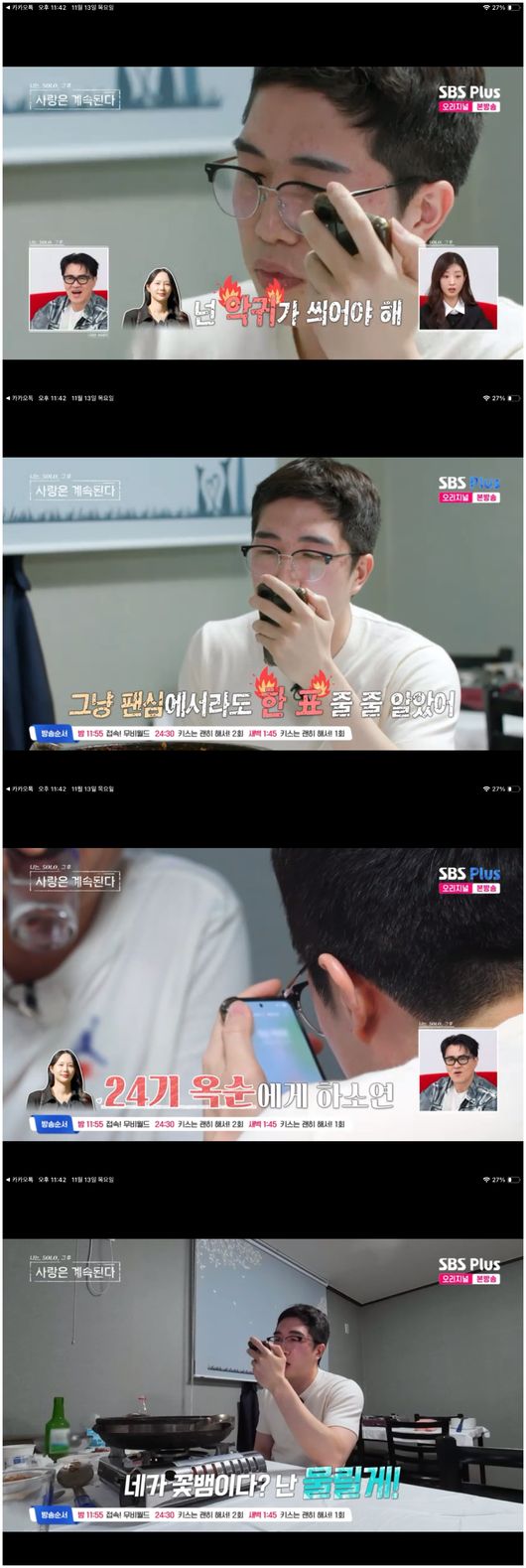 <리뷰:방송시청후작성된리뷰기사입니다.>[OSEN=오세진기자]‘나는SOLO,그후사랑은계속된다’24기영식이데이트선택에서한표도받지못하자울분을토했다.13일방영한ENA,SBSPlus예능‘나는SOLO,그후사랑은계속된다’(이하‘나솔사계’)에서는여성선택의데이트가이뤄졌다.갑작스레합류한메기백합은24기영수를선택하면서24기영수의마음을설레게만들어놓았다.거기에27기영호는생각지도못하게국화와용담에게선택을받으며인기남에등극했다.24기영식은첫인상선택그대로튤립을향한마음을두고있었다.그러나튤립은정작24기영수와달빛데이트에나섰고,18기영철과화기애애한분위기를이어나가고있었다.지난주24기영식의돌연마음고백에튤립은짐작도하지못해깜짝놀란표정이되었다.그나마24기영식을귀엽다고해준용담과백합이있었지만그들은모두다른상대방을선택했다.24기영식은우선운동으로마음을달래보려고했으나,이내혼자술을퍼마시는모습이등장했다.이어그는"누나야"라며누군가에게전화를걸었다.바로24기옥순이었다.24기영식은“24기옥순누나야,나는솔직히팬심에서라도한표줄줄알았어!네가꽃뱀이어도물려주려고했다고!”라며외쳤고,24기옥순은“넌악귀가씌어야해”라며차분하게코칭했다.이어나타난예고편에서24기영식은사계데이트권을따내기위한몸부림을치며,용담에게슈데권을쓰겠다는듯예고해시선을끌었다./[email protected][사진출처]ENA,SBSPlus예능‘나는SOLO,그후사랑은계속된다’Copyright©OSEN.무단전재및재배포금지.
