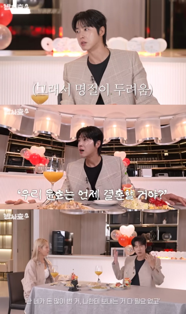 유노윤호[티브이데일리한서율기자]그룹동방신기멤버유노윤호가결혼에대한압박감을드러냈다.12일유튜브채널'효연의레벨업'을통해공개된'밥사효2'영상에서는유노윤호가출연해소녀시대멤버효연과다양한이야기를나눴다.이날대가족인유노윤호는명절에어른들에게받는질문에부담감을느낀다고고백했다.그는"5~6년전부터'결혼은언제하냐'라는질문을계속들어왔다.그래서명절이무섭다"라고말했다.그는"작은할머니께서는'돈많이버는거,선물보내는거다필요없다'며결혼을하라고하시더라"라고전했다.효연은"난아직(결혼하라는말을)들어본적없다.연예인이고화려한삶고있고돈을잘벌어다주면'결혼안해도된다'라는말을들을수있기도하지않나"라며그를위로했다.유노윤호는"결혼얘기를듣기시작할때부터나도모르게현실을느끼기시작한다"면서도"지금은꿈꾸고하고싶은거해도되는나이다"라고일에대한열정을드러냈다.[티브이데일리한서율기자[email protected]/사진=유튜브화면캡처]유노윤호[Copyrightⓒ*세계속에新한류를*연예전문온라인미디어티브이데일리(www.tvdaily.co.kr)/무단전재및재배포금지]Copyright©티브이데일리.무단전재및재배포금지.