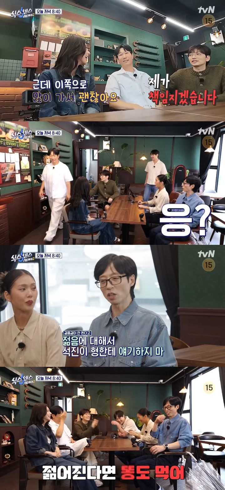 [서울=뉴시스]13일방송하는tvN예능프로그램'식스센스시티투어2'에선출연진이강북대학가에서가짜찾기에나선다.(사진=tvN'식스센스시티투어2'캡처)[email protected]*재판매및DB금지[서울=뉴시스]신지아인턴기자=코미디언유재석이지석진을모함한다.13일방송하는tvN예능프로그램'식스센스시티투어2'에선출연진이강북대학가에서가짜찾기에나선다.출연진은대학교앞한카페를찾는다.이날게스트로출연하는그룹아이들멤버미연은"너무시원하고좋다"고말한다.이에유재석은"석진이형때문에좀힘들었냐"고묻는다.미연은"(지석진)옆에앉아버렸는데오른쪽으로많이가셔서괜찮다"고한다.이후고경표는"걸음걸이로젊음테스트하는거아냐"며시범을보인다.지석진은"난맨날하는것"이라며따라하지만엉성한모습을보인다.이에출연진은"그거아니다"라며폭소한다.유재석은"젊음에대해서석진이형한테얘기하지마라"라고한다.그는"석진이형은젊어진다면대변도먹는다"고말해웃음을자아낸다.☞공감언론뉴시스[email protected]©뉴시스.무단전재및재배포금지.