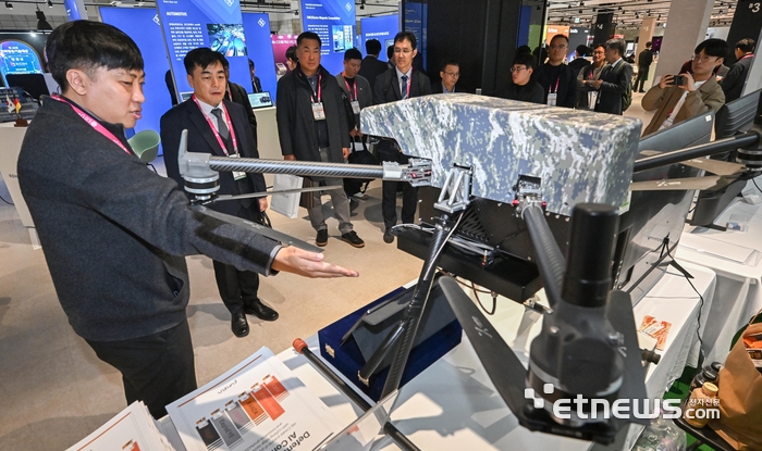 문성훈국방부정보통신기반정책담당관(왼쪽에서두번째)이13일서울강남구코엑스에서열린대한민국전파산업대전에서펀진의인공지능전자기스펙트럼정찰시스템을살펴보고있다.이동근기자[email protected]국내최대전파종합전시회인'2025대한민국전파산업대전(KRS2025)'이지난12일부터14일까지사흘간서울강남구코엑스에서열리고있다.'전파중심의AI·에너지·위성·국방산업미래를잇다'라는주제로위성·국방·보안분야다양한전파기술이전시된행사장에는첫날에만1000명이넘는참관객이방문했다.산학연전문가와군관주요인사들도전시장을찾아최신기술을살피고현장목소리를수렴했다.13일전파산업대전부스가꾸려진코엑스더플라츠홀에는수많은전파기업관계자와참관객으로북적였다.전날과학기술정보통신부와산하기관장,관련협·단체장이부스를돌아본데이어이날도국방부와주요기관실무진이현장을찾았다.한국전파진흥협회(RAPA)가주최한이번전시회에는국내외전파기업과중앙전파관리소,한국방송통신전파진흥원(KCA)등유관기관이참가했다.국내외총58개사가국방전파,무선전력전송(WPT),전자파적합성(EMC)테마존으로나눠109개부스를꾸렸다.(왼쪽일곱번째부터)남영준과학기술정보통신부주파수정책과장,문성훈국방부정보통신기반정책과장,정흥보한국전파진흥협회상근부회장특히전자전(戰)등전장에서전파기술중요성이부각되면서국방분야가이번전시에서핵심품목으로떠올랐다.문성훈국방부정보통신기반정책담당관을비롯해주요군관계자는이날부스를찾아고출력전자기파(EMP)방호장치,안티드론등방위산업기업의전파기술을직접살폈다.펀진은AI기반무선신호탐지기술과무인체계를융합한차세대전자전솔루션'KWM-Ocelot'을선보였다.회사관계자는“KWM-Ocelot은전자기스펙트럼드론정찰시스템으로소형드론에AI분석시스템을탑재해적의통신교란이나전파활동을실시간으로탐지하고위치를추적한다”고설명했다.아이스펙은핵EMP방호용HEMP필터를전시했다.적의EMP위협에대응해위성시스템용EMP방호장치개발을추진한다.이밖에도배터리파워솔루션은TVWS기반군전술작전용고속통신장비를,삼정솔루션은휴대용안티드론건장비를전시했다.문성훈국방부정보통신기반정책담당관(오른쪽)이13일서울강남구코엑스에서열린대한민국전파산업대전에서아이스펙의핵EMP방호용HEMP필터를살펴보고있다.이동근기자[email protected]보안,5G특화망등다양한전파융합기술도전시장을채웠다.LG유플러스는AI에이전트'익시오'에탑재된온디바이스기반안티딥보이스와실시간보이스피싱탐지등AI기반보안기능을소개했다.이노와이어리스는스마트폰모뎀보드를슬롯형태로장착한대규모트래픽시뮬레이터'XCAL-MUbox'를선보였다.행사를주최한RAPA도별도부스를꾸려전파플레이그라운드,산업생활주파수,교육사업등협회가수행중이다양한전파지원정책을소개했다.RAPA관계자는“이번전시회를통해전파를매개로한통신·AI·방산·위성산업등다양한분야기업이새로운협력모델과기술융합기회를모색했다”고밝혔다.박준호기자[email protected]©전자신문.무단전재및재배포금지.