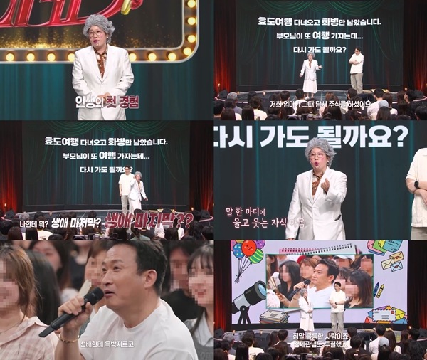 아이즈ize이경호기자KBS2TV'말자쇼'./사진제공=KBS2TV'말자쇼''말자쇼'가2주연속시청률3%대를기록,월요일밤예능강자로자리를견고히했다.지난27일방송된KBS2TV'말자쇼'는'인생의첫경험'특집으로꾸며졌다.시청자들과다양한인생의첫경험들을공유했다.이에이날'말자쇼'시청률은닐슨코리아전국가구기준3.1%를기록했다.직전방송분(4월20일)시청률3.0%보다0.1%상승했다.2주연속시청률3%대를기록한것은올해처음.'말자쇼'가월요일밤대표예능으로자리를확고히했음을보여준대목이다.이번'말자쇼'에서는"처음부모님과효도여행다녀오고화병만남았는데부모님이또여행가자고하신다"는고민이등장했다.'말자할매'김영희는자신의경험담을바탕으로가족들과의갈등을슬기롭게해결하는방법을제안했다.김영희는"가족은가장가깝지만모든게처음인관계"라며"그렇기때문에부딪히는경우가많다"고말했다.그러면서처음으로본인과어머니,남동생과함께일본후쿠오카·유후인여행을떠났던기억을전했다.김영희는"최상급여행을준비했지만후쿠오카에서유후인으로가는버스를예약하지않아여행일정이완전히망가졌다"면서"그때부터가족들눈치를보기시작했다"고털어놨다.김영희는계속되는어머니의불평,애써준비한여행코스를즐기지않고주식창만보는어머니의모습에결국폭발했다고회상했다.그는"돈은돈대로쓰고기분상한여행이됐다.다른좋은곳을모시고가도주식창만보신다"며"말한마디에자식마음이울고웃는다는걸부모님들이알아주셔야한다"고조언했다.또한이날게스트서경석은동기박명수와관련한에피소드를공개했다.서경석은"데뷔초이윤석과내가인기가있었을때상대적으로박명수는인기가떨어졌었는데,그때도박명수는잘될것같다고생각했다"고회상했다.그는"박명수는신인인데선배한테호통을치고윽박질렀다.그래서많이혼났다.그런데옆에서보면정말웃겼다"며"언젠가시대를제대로만나면박명수만의코미디가빛날거라고생각했다"고말했다.서경석은"박명수는굉장히성실한사람이었다.구두쇠라고하는사람도있지만쓸땐쓰고허투루는안쓰는사람이었다"며"당시나이트클럽행사를열심히해서우리끼리'양말은펑크나도행사는펑크안낸다'고말할정도였다"고덧붙였다.이밖에이날방송에서는특별한'처음'을경험한관객들과함께웃음꽃을피웠다.'전국노래자랑'첫도전에서예선탈락한여자관객이예선당시선보였던무대를선보여웃음바다를만들었다.또교관·선배앞에만서면얼어버린다는공군학군단후보생3인에게예능'진짜사나이'출신서경석이경례잘하는방법을특강해눈길을끌었다.Copyright©ize&ize.co.kr,무단전재및재배포금지