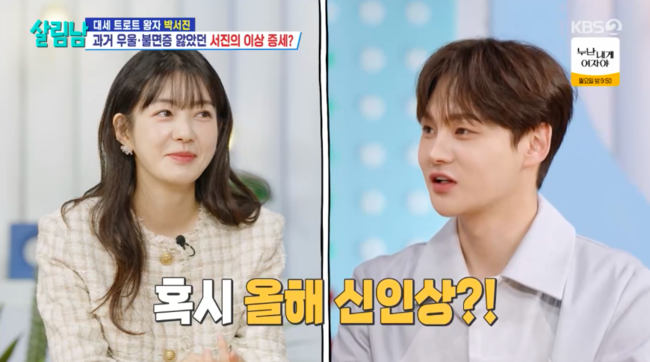 방송시청후작성된리뷰기사입니다.[OSEN=박하영기자]‘살림남’이요원이신인MC로올해‘연예대상’에서신인상을받을까?8일방송된KBS2TV예능‘살림하는남자들시즌2’(이하‘살림남’)에서는박서진이예능선배로서이요원에게조언하는모습이그려졌다.이날박효정은쓰레기분리수거르하다작년박서진의수상소감을적은노트를발견했다.박효정은“함보자.이미지나갔다”라고했지만,박서진은급히티셔츠안으로숨겼다.힘으로뺏은박효정은“이렇게열심히써놓고한마디도못했냐.‘살림남사랑해요’한마디로했냐”라고놀렸다.스튜디오에서유노윤호는“이때까먹은거냐”라고물었고,박서진은“원래기억을못한다”라고답했다.한편,은지원은이요원에게“연예대상가본적있냐”고물었다.이요원은“한번도없다”고했고,박서진은“누나28년만에첫고정MC인데이번년도신인상받는거아니냐”라고기대했다.이를들은유노윤호는“미리축하드립니다”라고했고,이요원은수줍게웃었다.반면박서진은“제가작년에신인상받아봐서안다.선배로서조언을해드린다면미리연습하는게좋다”라며‘연기대상’에서최우수상수상은이요원에게선배미를뽐냈다.이에은지원은“너나잘해”라고응수해웃음을안겼다./mint1023/@osen.co.kr[사진]‘살림하는남자들시즌2’방송화면캡처Copyright©OSEN.무단전재및재배포금지.
