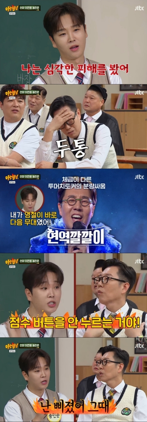 사진IJTBC‘아는형님’이찬원이송민준에게도벽이있다고밝혔다.8일오후방송된JTBC예능프로그램‘아는형님’(이하‘아형’)에는이찬원,선미,송민준이일일전학생으로출연했다.이날방송에서강호동은“찬원이볼낯이없다.500회축하해주러왔잖아.인터뷰까지했는데김영철이쓸데없이갑자기감동무대를해서!”라며분노했다.이에이찬원은“난인터뷰영상이안나갔고심지어노래도1절에서잘렸다”라고씁쓸해했다.이후제작진이당시이찬원의인터뷰영상을공개하자형님들은“정말고맙다”라며인사했다.강호동은“초대가수로온게아니라우리프로그램을정말사랑하는게느껴진다”고했다.이찬원은“난형님들을전부좋아하지만내인생의롤모델이자인생의전환점이되어준게호동이다”라고했다.이어“이찬원인생을바꾼프로그램은‘미스터트롯’이고‘스타킹’이다.스타킹에세번이나나갔다.난어느정도냐면‘스타킹’에대한충성심때문에‘무한도전’을본방송으로본적이한번도없다”라고밝혔다.그러나선미는“난‘스타킹’얘기만나오면치가떨린다”고말해웃음을자아냈다.송민준은“나는김영철피해자다.심각한피해를봤다.영철이랑‘현역가왕’을나왔다.영철이다음이내무대인데영철이가최저점을받은거다.영철이가진짜로삐쳐서그다음가수무대에서버튼을안눌렀다”라고말해형님들을놀라게했다.김영철은“민준아삐친것맞다.16표받았다”고인정했고형님들은“그럼16명한테고맙다고해야하는거아니냐”며비판했다.송민준은“난24표받아서영철이랑같이방출후보가된거다.그런데영철이가내속도모르고‘우리방출소년단으로활동하는거아니냐’고하는거다”라고덧붙였다.이찬원은“민준이가만약25표받았으면방출후보아니었다”라고거들었다.이후선미에관한질문이쏟아졌다.원더걸스중가장좋았냐는질문에강호동은“난진짜똑같이좋았다”고강조했다.이에선미는“그런데호동이는소녀시대를좀더좋아했다.‘스타킹’에서편애했다.소녀시대랑같이출연했는데소녀시대멤버들을더밀어줬다”라고밝혔다.김희철은“아이고우리태연씨!아니선미지금뭐하는데?”라고시뮬레이션해웃음을주기도.선미는“원더걸스가숫기가좀없었다”라며직접해명했다.사진IJTBC‘아는형님’이후선미의콘서트티켓을걸고문제맞히기가진행됐다.신동은“원더걸스는데뷔전그룹명이달랐다.그이름은무엇일까”라고질문했다.JYP걸스,원더우먼등오답이쏟아지는가운데이상민이‘레이디스클럽’이라고외쳐정답을맞혔다.선미는“나상민이가맞힐줄알았다.레이디스클럽이번화가에있던클럽이름이라고하더라”고했고이상민은“근데그걸내가왜...”라고당황해웃음을안겼다.또이찬원은송민준이도벽이있다고밝혔다.찬원은“인상도좋고선해보이는데최근술을먹기시작했다.그동안사놓은고급술들이집에진열되어있다.민준이를초대했는데술이몇개비더라”고말했다.민준은“찬원이는얼큰하게취해있었고내가고급위스키를모으는취미가있으니까하나달라고했다.찬원이가하나가져가라고했는데취해있으니까하나더가져가도모를것같아서(하나더가져갔다)”라고말해형님들을당황하게했다.이상민은“일단민사로시작해야하고형사처벌도가능하다.갖다주는건정상참작은되지만금전적인걸이동시켰으니범죄다.심각한처벌도가능하다”라고평가했다.민준이가장비싼술인걸알고가져갔다고하자강호동은“이건진짜실드못쳐주겠다”며손절하기도.다음으로세사람은뺏고싶은노래가있냐는질문에답했다.이찬원은“영탁이형의‘찐이야’다.‘미스터트록’결승전에서순위대로곡을뽑는거였다.임영웅-이찬원-영탁이순서대로뽑았다.그런데‘찐이야’를앞에서안뽑았다.‘엘리제를위하여’노래로시작하니까생소해서안했는데지금모르는사람이없다”라며아쉬움을드러냈다.선미는“내목소리는조금중저음에탁한소리가있는데아이유는되게맑고청아한소리다.그래서난아이유목소리로‘가시나’를부르고싶다.그게되게부럽다”고밝혔다.방송뒤에는선미의아바타소개팅이이어졌다.선미는송민준,김영철,이찬원,강호동,미미미누와소개팅했지만사실이상민,김희철,이수근,서장훈,민경훈이조종하고있었던것.선미가이행시잘하는이성에게끌린다고하자이찬원(이수근)은“마침컨트리곡이준비되어있다.컨츄리꼬꼬의‘김미김미’불러드리겠다”라고말해좌중을폭소케했다.강호동은선미이행시에“선미야사랑해,미안해”라고말해웃음을안겼다.‘아는형님’은매주토요일오후9시JTBC에서방송된다.[서예지스타투데이객원기자]Copyright©스타투데이.무단전재,재배포및AI학습이용금지