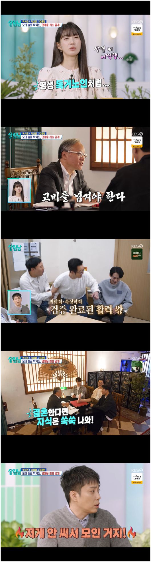 <리뷰:방송시청후작성된리뷰기사입니다.>[OSEN=오세진기자]'살림남2'결혼23년차이요원이남편에대한쿨한모습을보였다.1일방영된KBS2TV예능'살림남2'에서는16살연하쇼호스트신보람과의관계가소원해진지상렬의모습이등장했다.지상렬은이미신보람에게말실수를했다는생각에모든게끝이났다며시름시름앓았다.신보람의나이대를듣고그만의독한농담으로"갱년기네,이제훨훨날아가라"라며농담을던졌는데신보람이당황하며자리를떴던것이었다.이런지상렬을응원하기위해김종민과박서진이등장했다.그러나박서진은모태솔로로서,그리고냉철한시선과발언으로지상렬의화를돋우었다.지상렬은"너노래더이상안하고싶어?"라며우스운느낌으로경고를해웃음을안겼다.김종민은나름의생각을전했다.그딴에는신보람의마음을풀어주기위해일단말을다정하게해보라고조언했다.이를테면사랑한다는말을해보란것이었다.이에박서진은물론지상렬까지질색했다.이요원은“사랑한다는말을자주해줘야한다”라며강조했다.살림남출연자중가장오랜결혼생활과함께아이도가장많이낳은이요원으로서는꽤권위있는조언같았다.박서진은“그럼사랑한다는말을마지막으로한게언제냐”라며대뜸물었다.이요원은“애들한테는자주해준다”라고말했다.은지원은“남편한테는왜안해주냐”라며캐물었고,이요원은“이제그분한테는안해줘도돼요”라고말해웃음을안겼다.박서진은지상렬의솔로행을걱정하며'족상'철학원을찾았다.한마디로발바닥모양을보고인생을짚는것이었다.철학원에서는“달밤의황제다.만약결혼하면자식은쑥쑥나온다”라며지상렬의미래를읽었다.이요원은“얼른장가가셔서아이를낳아야겠다”라고말했다.은지원은“저게안써서모인거지!얼른결혼을해야한다”라며거침없는발언으로이요원의고개를푹숙이게했다.다만철학원에서는“내년까지는결혼운이있다.그런데이번에안되면,상당히이제오래걸릴거다”라며지상렬에게말했다.그는“고비를넘겨야한다”라며지상렬에게마치지금신보람과의고비가있다는것을알고있는것처럼말했다.박서진은내친김에지상렬의외모를가꾸기위해가발원을찾았다.지상렬은"내가아래머리숱은많으니까위를신경써달라"라면서여러가지변신을했다.이어지상렬은꽃을사들고신보람을만났다.지상렬은“내가동생들과편하게이야기를하던게버릇이밴것같다”라며자신의말실수를인정했고,신보람은“오빠는말을좀더예쁘게해야한다”라고말했다.그러자지상렬은“고양이가되라면고야이가되겠다.야옹”이라고말하며신보람만을위한귀여운남자로거듭날것을약속했다./[email protected][사진출처]KBS2TV예능'살림남2'방송화면캡처Copyright©OSEN.무단전재및재배포금지.