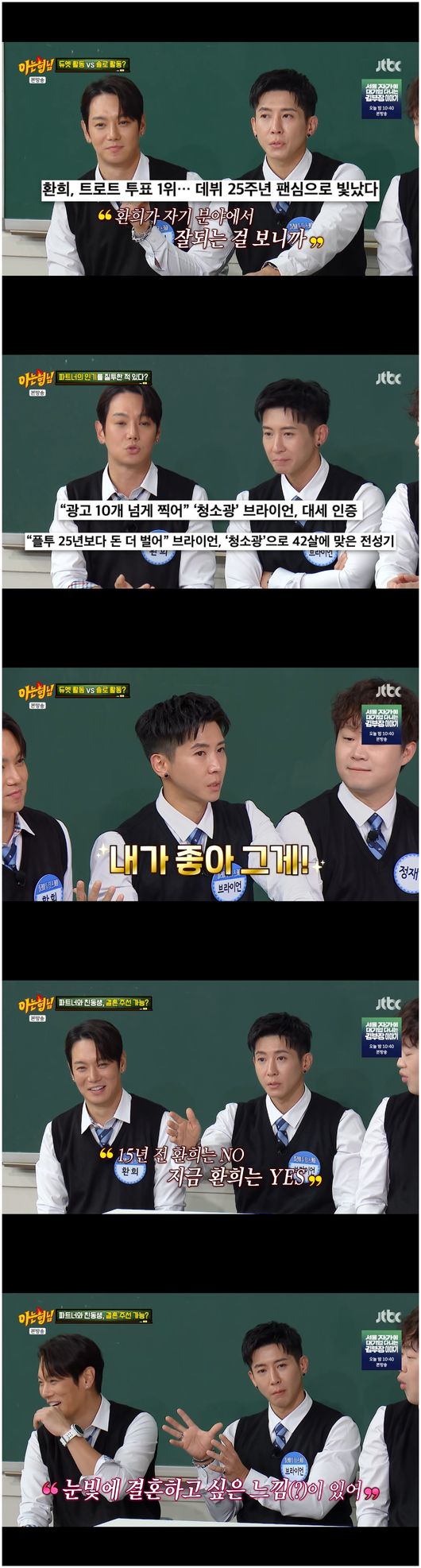 <리뷰:방송시청후작성된리뷰기사입니다.>[OSEN=오세진기자]‘아는형님’플라이투더스카이환희와브라이언이20년우정과함께농담을꽃피웠다.1일방영한JTBC예능‘아는형님’에서는플라이투더스카이환희,브라이언그리고피식대학이출연했다.환희와브라이언은오랜만에듀엣으로나왔지만앨범발표는없다고말했다.그렇지만이들은종종함께활동하곤해팬들의기대를사기도했다.브라이언은“환희가나‘청소광’,‘라디오스타’,‘전참시’나갈때마다같이나왔다.목상태가안좋아서음악을못해서그걸로스트레스를못한다”라면서“환희가기다려주고있다.사람들이플투왜활동안하나,이러는데그게안돼서내가힘들다”라고말했다.강호동은"치료등트레이닝을하면되는거아니냐"라며물었다.브라이언은“치료를받고,트레이닝을받지만정신적으로문제가있다고한다.내뇌가‘너는노래를더못한다’라고한다더라”라고말했다.환희는“운동선수가입스가온것같은것이다.가수인데도노래를못하는거다”라며친절히설명했다.팀으로데뷔해각자활동하는것이어떤부담인지알테지만,이들은서로가잘됐던것을응원했다.그만큼의시간이있었고신뢰가있었으며그만큼싸우기도했던두사람.이수근은“보통남성듀오라고하는데,둘은혼성듀오같다”라며질문을던졌다.브라이언은“환희너말조심해라”라며환희를장난스럽게째려봤다.환희는“강호동은어릴때부터우릴봤다.우리도어려서엄청싸웠다.그런데내가말싸움을이기질못했다”라면서“브라이언이여성같았다.그러니까,고집센고약한기센할머니같았다.그래서우리둘다남자지만혼성듀오로활동하는구나,이렇게마음을먹었다”라고말해마치오래산부부처럼말했다.이에브라이언은“그런말하지마라.이양반아,네가몇번이겼어”라며꼬장꼬장하게대답해웃음을안겼다.김영철은“우정팔찌를오래끼고다닌다는데”라며물었다.브라이언은“2002년도부터우정팔찌를끼고다녔다.3년전부터다시찾아서차고다닌다”라며화려한이니셜까지박은팔찌를공개했다.그러나환희는집에팔찌를두고온상황이었다.환희는“난집에있어”라고말했고브라이언은“내가같이하자고했지!”라며노려봤다.환희는최근트로트가수로새롭게얼굴과이름을알리고있다.브라이언은"나는TV에환희가나왔을때좋았다.내가끝까지같이가주지못했으니까"라면서"팬들이그러더라.환희오빠말려달라고.그렇지만나는환희가좋아하는걸하는게좋다"라며환희의편을들었다.이렇게훈훈한두사람이지만서로에게여동생을소개해줄수있냐는질문에브라이언은“15년전환희는안되는데,지금은된다.지금은눈빛자체는결혼을하고싶은느낌이있다.여동생소개도괜찮다”,환희는“난좀힘든데?가족이니까.브라이언은누가없어도된다.내여동생이없어도혼자잘할거같다.내여동생이잔소리를더들을거다"라며상반된입장을보여웃음을안겼다./[email protected][사진출처]JTBC예능‘아는형님’Copyright©OSEN.무단전재및재배포금지.