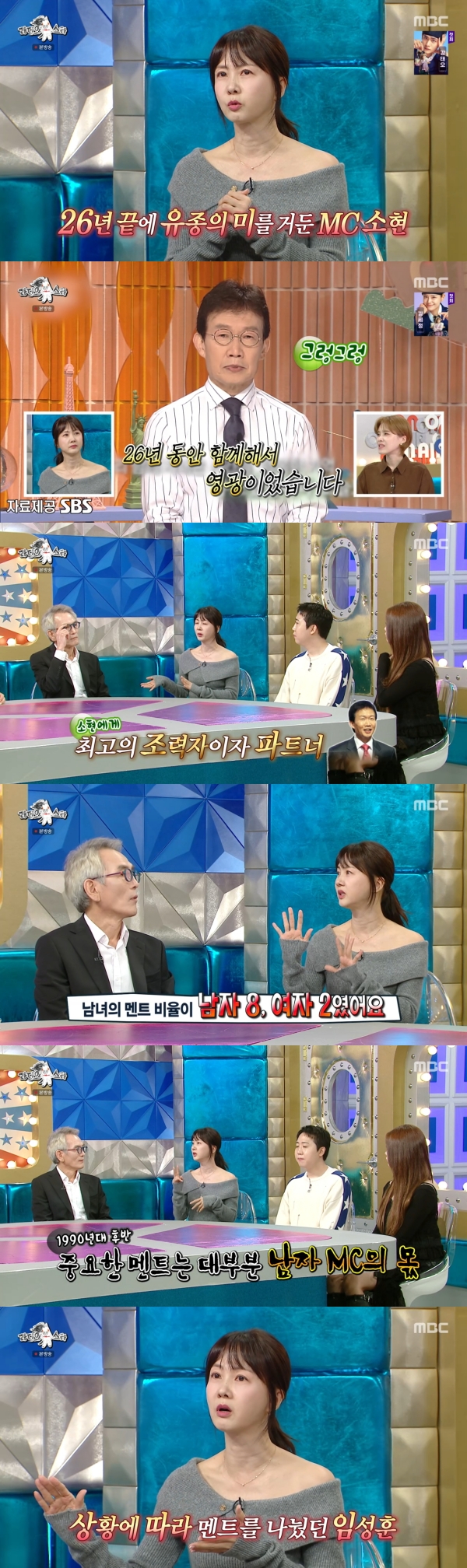[스포츠조선이게은기자]방송인박소현이선배임성훈에게고마움을전했다.29일방송된MBC'라디오스타'는정관용,박소현,이재율,츠키가함께하는'네분토론진행시켜'특집으로꾸며졌다.박소현은'세상에이런일이'를MC교체없이26년간진행했다며총1279회를맡았다고전했다.그는"처음맡았을때는배우로활동할때라MC자리가너무부담스러웠다.어려울것같다고하니관계자가'아이템을찾기힘드니6개월내로폐지될거다'라고했다.근데26년을했다"라고떠올렸다.마지막녹화상황에대해서는"2024년1월8일에폐지소식을들었고5월에마지막녹화를했다.처음에는실감이안났고점차무게감이느껴지기시작했다.감정이북받쳐엔딩멘트를못하겠더라.임성훈선생님이클로징을하는데,거기서눈물을쏟으셨다.그순간나까지울면녹화를못할거라는생각이들었다.무조건마무리를해야겠다는생각에마무리를했다"라고떠올렸다.마지막회영상이공개되자박소현은울컥했다.실제영상속박소현은방송을담담하게잘마무리지만속은말이아니었다고.박소현은"사실저때제정신이아니었다.마무리하고눈물이막쏟아졌다"라고말했다.특히박소현은임성훈에게진심가득한감사인사를전해눈길을끌었다.박소현은"만약임성훈선생님을못만났다면지금의저는없었다.최고의조력자이자파트너다.20대때처음그프로그램을맡았을때남녀멘트비율이남자가8,여자가2였다.당시남자MC가여자MC멘트를뺏기위해손을잡는다거나발을밟기도했다.근데임성훈선생님은젊은감성으로읽는게낫겠다며,멘트를계속넘겨주며5대5로맞춰줬다.내가MC로잘성장하도록해주셨다"라고말했다.이어"마지막방송에서'소현아,수고했다.고마워'라고하셨다.26년간'소현씨'라고부르셨지사석에서도한번도'소현아'라고한적이없었다"라며결국눈물을쏟았다[email protected]©스포츠조선.무단전재및재배포금지.