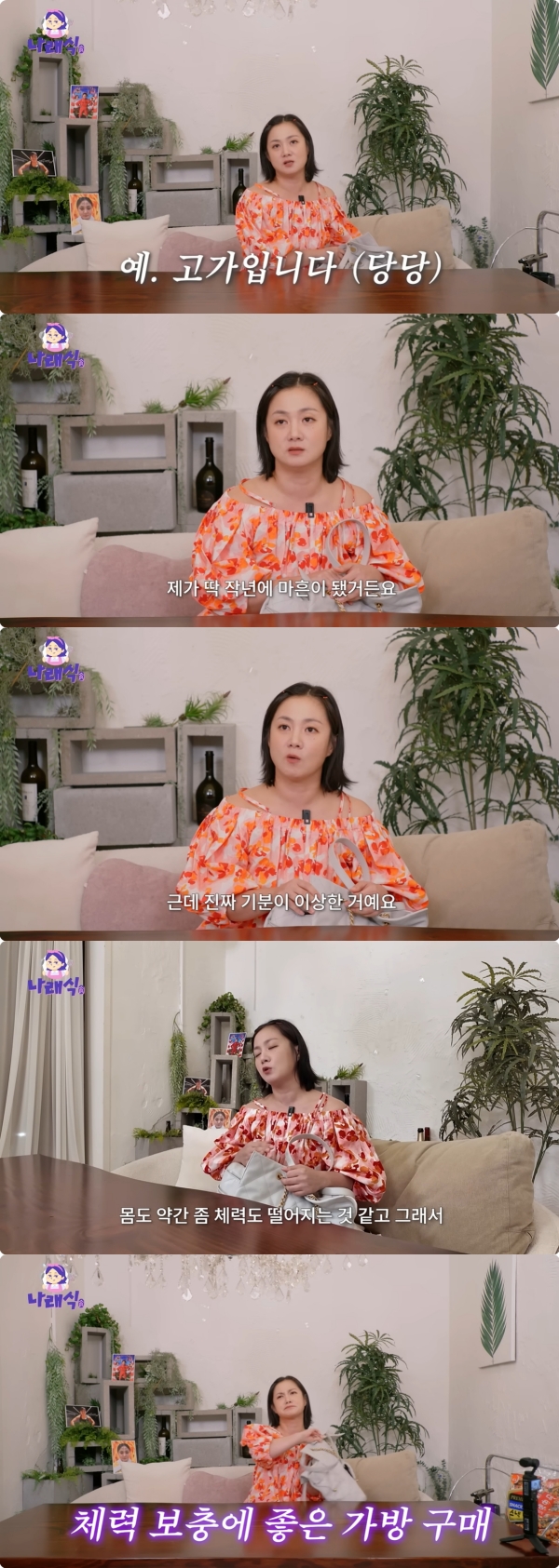 사진=‘나래식’채널영상캡처사진=‘나래식’채널영상캡처사진=‘나래식’채널영상캡처[뉴스엔이하나기자]박나래가40살이된자신을위해명품백을셀프선물했다고밝혔다.10월29일‘나래식’채널에는‘나도손벌벌덜면서샀는데’라는제목의영상이공개됐다.박나래는“저희가구독자가32만이넘었다.‘나래식’을하다보면댓글을많이달아주시는데거기에간혹저의찐템들을궁금해하시는분들이있어서지금집에서거의트럭한대분량이왔다”라며실제자신이사용중인주방용품,식기류등을공개했다.제작진은박나래에게‘왓츠인마이백’을해달라고요청했다.자신이들고온명품브랜드샤넬가방을공개한박나래는“일단이가방은고가다”라고말문을열었다.박나래는“제가딱작년에마흔이됐다.근데진짜기분이이상하더라.39까지괜찮았는데40이되는순간뭔가되게좀이상하더라.체력도좀떨어지는것같고.그래서가방을질렀다.마흔이된나를위해서(선물했다)”라며“복주머니처럼모양을만들수도있고,수납이많다”라고소개했다.뉴스엔이하나bliss21@기사제보및보도자료[email protected]ⓒ뉴스엔.무단전재&재배포금지Copyright©뉴스엔.무단전재및재배포금지.