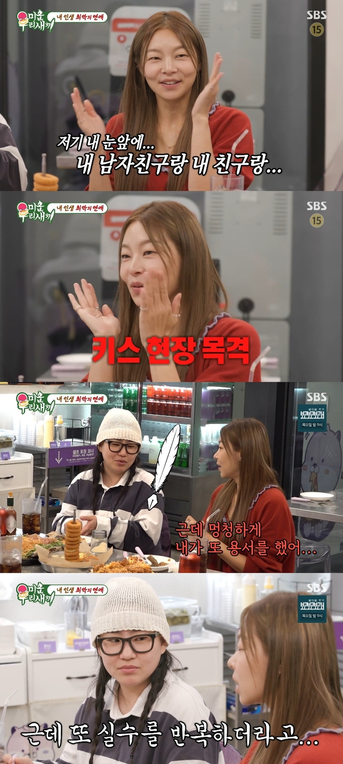 ‘미운우리새끼’사진|SBS송해나가최악의연애를밝혔다.26일오후방송된SBS예능프로그램‘미운우리새끼’(이하‘미우새’)에서송해나가전남자친구의만행을밝혔다.이날방송에서송해나는“연애안한지4년됐다.썸도안탄다”며“항상끝이안좋았다.바람을피웠다.예전남친의생일파티였다.카페를통으로빌려서지인들을초대했다.화장실이건물밖에있었다.화장실을다쓰고나오려고문을여는순간남친이랑내친구가키스를하고있는것”이라고말해모두를놀라게했다.이어“사람이당황하잖아?화를내야하는데도조용히집으로갔다”고덧붙였다.신동엽은“저건미친것”이라며혀를내둘렀다.송해나는“술취해서그랬다고사정하길래멍청하게용서했어.내가너무좋아했었어.근데또실수해서헤어졌다.그때충격많이받았다”고말했다.일요일오후9시5분SBS에서방송된다.[서예지스타투데이객원기자]Copyright©스타투데이.무단전재,재배포및AI학습이용금지