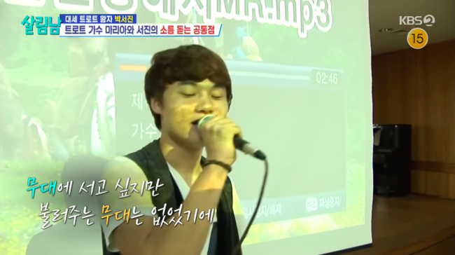 방송시청후작성된리뷰기사입니다.[OSEN=박하영기자]‘살림남2’박서진이노래교실을다녔던과거를떠올렸다.25일방송된KBS2TV예능‘살림하는남자들시즌2’(이하‘살림남’)에서는박서진이마리아에게영어수업을받는모습이그려졌다.어느덧6년차가수가된마리아는“어르신들의사랑을어떻게받냐”라고물었다.박서진은“옛날에는버스킹하고CD들고노래교실가서홍보했다”라고답했다.마리아가“노래교실들어보기만하고가볼기회가없었다”라고하자박서진은“가면‘예쁘다예쁘다’칭찬을많이해준다.‘내가이렇게사랑받는가수구나’하면서자신감이뿜뿜해진다.그기운들이상당하다”라고밝혔다.이어“‘넌안돼,넌못할거야’이런이야기듣고,사기당하고우울감에빠져있던그시기에노래교실돌기시작했다”라며“저희무명가수들한테정말서고싶은무대였다.꼭거쳐가야하는무대”라고힘들었던시절을회상했다.그러면서“노래교실에서떠야지만노래가뜰수있다는말이있다.그래서소개시켜주고싶었다”라며추천한이유를밝혔다./mint1023/@osen.co.kr[사진]‘살림하는남자들시즌2’방송화면캡처Copyright©OSEN.무단전재및재배포금지.