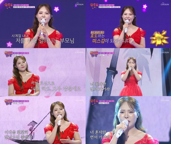 ‘금밤’미스김,부모님은퇴뜬소문해명(제공:TVCHOSUN)미스김이부모님을향한뜬소문을해명하고시원한사이다보이스를뽐냈다.지난24일방송된TVCHOSUN‘트롯올스타전:금요일밤에’(이하‘금밤’)는추석특집‘도전!꿈의무대’특집으로꾸며졌다.‘미스&미스터’멤버들이다양한사연과함께노래를준비한이날,첫주자로나선미스김은무대에앞서“저희부모님은매년봄이되면전국의아카시아를찾아서여름이끝날때까지꿀을따신다.그리고가을과겨울에는배추농사를지으신다.병원에가실시간도없이허리가굽도록하루종일일만하시는데요즘이상한소문이돈다”고말을꺼냈다.미스김의부모님을둘러싼뜬소문의정체는미스김이돈을많이벌어부모님이양봉일을그만두셨다는것이었다.미스김은“고급아파트에서떵떵거리면서살고있다고잘못된소문이났는데전혀아니다.제가도와드리려고해도저희부모님은‘알아서잘살테니너노래열심히하라’고거절하신다”고해명했다.이어“제가잘돼서나온소문이니다들속지마시고,앞으로노래를더욱열심히해서효도하는미스김이되겠다.감사하다”며진심어린인사를덧붙였다.이호섭도해명에말을보탰다.“미스김을KBS’전국노래자랑’,‘아침마당’등에서자주만난다.그래서미스김의부모님과도인연이있고사정을잘안다.미스김부모님과오랜만에만나서악수를하면손이안떨어진다.꿀때문에손이쩍쩍달라붙는다”는MSG가득한이호섭의멘트는관객들에게큰웃음을자아냈다.이에힘을받은미스김은“소문에대한억울함을노래로풀겠다”며부모님이좋아하는곡인나훈아원곡의‘무심세월’을선곡했다.‘무심세월’은트로트특유의서정성과강렬한감정을잘살려낸곡.평소사이다보이스라는애칭으로불릴만큼많은트롯팬들에게사랑받는미스김은이날도감탄할만한깊고풍부한성량과섬세한표현력으로무대를완성했다.특히세월의무심함속에서느껴지는인간의고독과이를극복하려는의지가담긴가사와멜로디는미스김의진심이담긴해석과만나한층더깊어진감동을선사했다.한편미스김은긍정에너지와사이다보이스,무한재생을반복하는중독성까지더해진‘될놈’으로100%매력을전하고있다.최근전국행사장에서떼창을유발하는‘될놈’의매력은각종방송과현장에서만나볼수있다.송미희기자bnt뉴스연예팀기사제보[email protected]©bnt뉴스.무단전재,재배포및AI데이터활용금지
