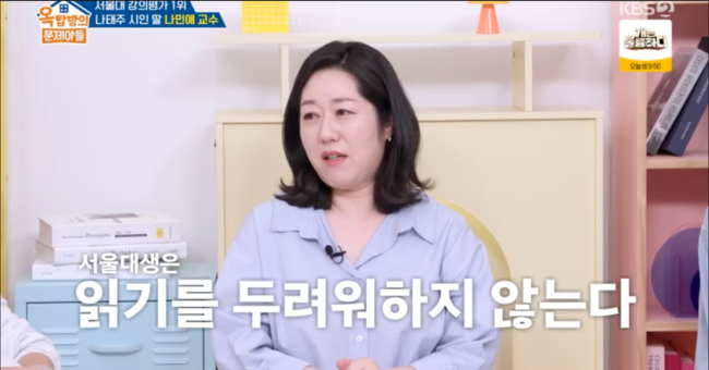 방송시청후작성된리뷰기사입니다.[OSEN=박근희기자]'옥탑방의문제아들’나태주시인의딸이자서울대학교에서글쓰기수업을담당하고있는나민애교수가서울대학생들이가진학업적강점과특징에대해설명했다.23일전파를탄KBS2TV예능‘옥탑방의문제아들’(이하‘옥문아’)에서는서울대생들이사랑하는글쓰기교수이자나태주시인의딸,나민애교수가옥탑방손님으로찾아왔다.나교수는과거나태주시인이해당프로그램에출연했던사실이언급되자,“아버지가3인이상모이면선생님모드다.교장선생님”이라며“말이많다”고밝혀스튜디오를웃음바다로만들었다.나태주시인의딸이자서울대학교글쓰기교수인나민애교수가한방송에출연해아버지에대한유쾌한폭로와함께서울대생들의특징을분석했다.나교수는과거나태주시인이해당프로그램에출연했던사실이언급되자,“아버지가3인이상모이면선생님모드다.교장선생님”이라며“말이많다”고밝혀스튜디오를웃음바다로만들었다.19년째서울대에서학생들을가르치고있는나교수는지난2019년서울대강의평가1위를기록한명강의의소유자다.그는학생들의평가중“서울대와서가장좋은건나민애선생님수업을들은것”이라는극찬이있었다고전하며감동했음을밝혔다.나교수는명문대학생들의특징에대해서도구체적으로설명했다.그는서울대생들이“읽기를두려워하지않는다”며,“어려운책을줘도읽으려고덥석문다”고강조했다.이어“어려운단어를접하면자기것으로만들려고노력하는단어부자들이많다”고덧붙였다.이들은“책읽기가득이되는행위라는걸알고적극적으로읽으려고한다”는것이나교수의분석이다.이에MC양세찬은“어렸을때책을안읽어서정말아쉽다”며후회하는모습을보여웃음을자아냈다./[email protected][사진]‘옥탑방의문제아들’방송화면캡쳐Copyright©OSEN.무단전재및재배포금지.
