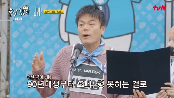 tvN‘출장십오야XJYP스카우트’tvN‘출장십오야XJYP스카우트’[뉴스엔유경상기자]박진영이90년생부터자신에게형이나오빠라는호칭을못쓴다고말했다.10월22일첫방송된tvN‘출장십오야XJYP스카우트’1회에서는박진영,투피엠,데이식스,트와이스,스트레이키즈,있지,엑스디너리히어로즈,엔믹스,니쥬,넥스지,킥플립이한자리에모였다.JYP스카우트참가자중에서최고령자인박진영대표와막내킥플립케이주가함께대표로선서를했다.두사람의나이는35살차이.나PD는호칭을궁금해하며“가장큰형이라고해도되냐.대표님을뭐라고부르냐”고질문했다.트와이스지효는“피디님”이라고부른다고답했다.박진영은“우리가원래회사출범할때90년대생부터오빠,형못하는걸로했다.남들이볼때적합하지않다고.남자들은무시하고형이라고부르는애들도있다”고말했다.박진영의말에엑스디너리히어로즈멤버들이31살나이차이에도불구하고박진영을“형”이라고부르는모습으로눈길을끌었다.(사진=tvN‘출장십오야XJYP스카우트’)뉴스엔유경상yooks@기사제보및보도자료[email protected]ⓒ뉴스엔.무단전재&재배포금지Copyright©뉴스엔.무단전재및재배포금지.