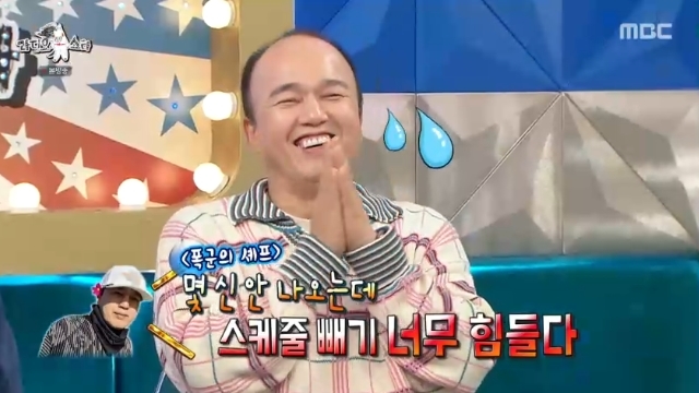 MBC‘라디오스타’캡처MBC‘라디오스타’캡처[뉴스엔서유나기자]방송인김구라가'폭군의셰프'촬영당시짜증냈던배우김광규를폭로했다.10월22일방송된MBC예능'라디오스타'(이하'라스')937회에는김광규,김완선,홍윤화,조째즈가게스트로출연했다.이날김구라는김광규가"최근종영한'폭군의셰프'가순간시청률이20%를찍었다.감사할따름"이라고하자"'폭군의셰프'촬영하던시기저와같이골프콘텐츠에출연해서하는말이'몇신안나오는데스케줄빼기너무힘들다'고그랬다.신이별로걸리지도않는데오라가라하니까사람으로짜증날수있다"고폭로했다.멋쩍은웃음을보인김광규는"그때잠깐그랬다.요리장면찍을때2,3시간찍는다.숙수니까뒤에서있어야한다.여기서찍고저기서찍고계속걸린다.또그때너무더웠다.34도로올라가땀이줄줄났다.전대사도그렇게많지않았다"고해명했고"그래서그때예민했구나"라며이해한김구라는"주로한대사가뭐냐"고물었다.김광규는"대령숙수,파좀주게"라고답해웃음을자아냈다.김광규는드라마를재밌게봤다는김완선에"여러분덕분에정말10년만에포상휴가를가게됐다"며감사한마음을전했다.뉴스엔서유나stranger77@기사제보및보도자료[email protected]ⓒ뉴스엔.무단전재&재배포금지Copyright©뉴스엔.무단전재및재배포금지.