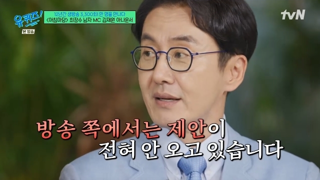 tvN‘유퀴즈온더블럭’캡처tvN‘유퀴즈온더블럭’캡처[뉴스엔서유나기자]KBS를퇴사한아나운서김재원이퇴진후방송섭외가전무한사실을밝혔다.10월22일방송된tvN예능'유퀴즈온더블럭'(이하'유퀴즈')315회에는'아침마당'최장수남자MC김재원아나운서가게스트로출연했다.이날김재원은프리랜서가된후"다양한제안이오는데방송쪽에선전혀제안이안온다,안타깝게도"라고털어놓았다.어떤프로를원하냐는질문에"자식채널욕심이있다.세계사,한국사"라고답한김재원은"여행프로욕심도있다"며"세계60여개국을여행했기때문에다양한여행경험으로어디든갈수있다.무엇이든할수있다"고어필했다.이어"퇴사하고나니방송을잘못보겠더라.보다보면'저거나도할수있겠는데'라는생각이들어서한동안지색채널을잘못봤다.예능은나랑상관없으니까보다가또'어?저정도는나도할수있겠는데'라는생각이들어서드라마만봤다.그런데또'잠깐,저정도조연이면나도할수있겠는데'라는생각이들더라"면서탐나는역할로는앵커,사회자,중년의직장인,퇴직자역을언급했다.한편1995년KBS공채21기로입사해약12년동안'아침마당'을진행한김재원은지난7월말30년넘게재직한KBS아나운서국을떠나며'아침마당'MC자리에서도하차했다.퇴사전'아침마당'뿐아니라‘KBS뉴스25’,‘아침마당토요일가족이부른다’,‘6시내고향’등KBS간판프로그램에서진행자로활약했다.뉴스엔서유나stranger77@기사제보및보도자료[email protected]ⓒ뉴스엔.무단전재&재배포금지Copyright©뉴스엔.무단전재및재배포금지.