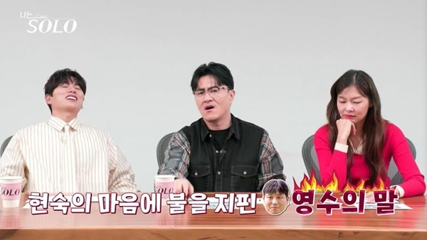 ENA,SBSPlus‘나는SOLO’ENA,SBSPlus‘나는SOLO’[뉴스엔유경상기자]현숙이영수의어장에다시빠진모습에데프콘이분노했다.10월22일방송된ENA,SBSPlus‘나는SOLO’에서는돌싱특집28기현숙이2픽영수를정리했다가다시금홀렸다.현숙은1순위상철,2순의영수에게호감표현을하다가상철이현실적으로현숙의아이가3명이라는사실에부담감을드러내자상철을정리하며바로영수도정리해버렸다.현숙은영수가자신의표현을받아주기는하지만따로자신에게표현하지않자마음이없다고봤다.이어현숙은영수에게“멋진사람이고조건도좋고받아준다는데난줄것이내매력밖에없는것같아불안했다”며“난힘든사람이다.너는멋지잖아.다른사람만나면좋겠다”고말했다.이에영수는“나그렇게대단한사람아니다”며“어제매력을알았던것같다”고현숙이오해할수있는말을했다.영수는“최종선택은현숙님마음이고누가있다면적극적으로표현하면좋겠다”고말했다.송해나가“이건단순한친절은아닌것같다”며탄식했고데프콘도“정리하러가서또꼬시면어떡하냐”고분노했다.이이경이“저거여지(주는거)죠?”라고묻자데프콘과송해나가동시에“여지지”라며흥분했다.현숙은“영수가반응을안해주면갈자신이없다.반응을해주면갈수있다.표현을확실하게해주면영수에게갈거고헷갈리게할거면포기하고싶다.내가매달리기에는과하다”고말했고,영수가“이야기해줘서고맙다”고하자긍정적인반응으로알아들었다.현숙은제작진과인터뷰를하며“우와,안망했다”고밝게웃었고,데프콘은“영수가말을개떡같이했다”며현숙을오해하게한영수의말에분노했다.(사진=ENA,SBSPlus‘나는SOLO’캡처)뉴스엔유경상yooks@기사제보및보도자료[email protected]ⓒ뉴스엔.무단전재&재배포금지Copyright©뉴스엔.무단전재및재배포금지.