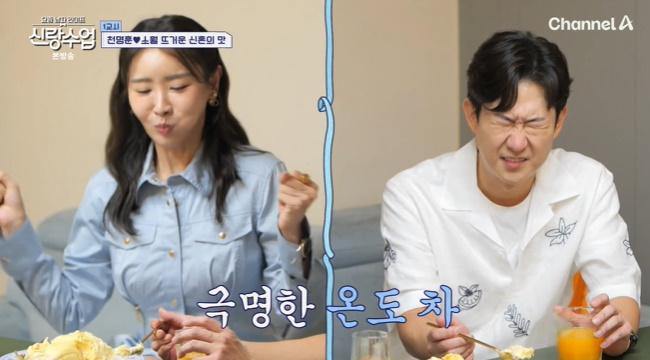 사진=채널A‘요즘남자라이프-신랑수업’캡처사진=채널A‘요즘남자라이프-신랑수업’캡처사진=채널A‘요즘남자라이프-신랑수업’캡처[뉴스엔이하나기자]천명훈이두리안으로짝사랑하는소월과더가까워졌다.10월22일방송된채널A‘요즘남자라이프-신랑수업’에서는소월이천명훈의집에방문한모습이공개됐다.천명훈의집에초대된소월은안방등집을구경하던중천명훈이깜짝준비한두리안을보고한껏들떴다.천명훈은“사실은널위해서준비하긴했는데”라면서도자신은두리안을잘먹지못한다고털어놨다.소월은두리안을두려워하는천명훈의코를잡은뒤두리안을먹게했고,천명훈은“숨안쉬고먹으니까훨씬맛있다.근데먹을만해”라고반응했다.소월은“이것만있으면밥안먹어도돼”라며남다른두리안사랑을드러냈다.특히천명훈이먹었던숟가락을그대로공유해영상을지켜보던출연자들을놀라게했다.문세윤은“한숟가락쓰는사이게됐네”라고반응했다.두사람은나란히앉아두리안과천명훈이직접짠오렌지주스를먹었다.두리안을먹고춤까지추는소월과달리천명훈은정반대반응을보여웃음을자아냈다.뉴스엔이하나bliss21@기사제보및보도자료[email protected]ⓒ뉴스엔.무단전재&재배포금지Copyright©뉴스엔.무단전재및재배포금지.