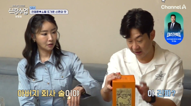[스타뉴스|한해선기자]/사진=채널A'신랑수업'방송캡처가수천명훈이'짝사랑녀'소월을처음으로자신의집에초대했다.22일방송된채널A'요즘남자라이프-신랑수업'(이하'신랑수업')에서는천명훈이양수리집으로소월을불러함께집인테리어를하고요리를대접했다.천명훈은대청소를하고소월을맞이,소월은천명훈집에들어와천명훈에게고량주를선물했다./사진=채널A'신랑수업'방송캡처천명훈은긴장한탓에"초대해주니까고맙다"라고말했고,소월은고량주선물에대해"아버지회사술이다"라고말했다.스튜디오에서모니터링하던이승철은"아버지가술회사를하시냐"라고물었고,천명훈은"저희장인어른이그러시다"라며어깨를으쓱했다.소월은"우리아빠가여기(주류회사)주주다"라고설명했다.한해선기자[email protected]©스타뉴스&starnewskorea.com,무단전재및재배포금지