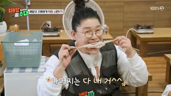 방송화면캡처<방송시청후작성한리뷰기사입니다.>[OSEN=장우영기자]‘배달왔수다’신기루가김민경을저격했다.22일방송된KBS2‘배달왔수다’에는대량주문으로이영자,김숙을당황하게한역대급먹보조혜련,신기루,김민경이출연했다.방송화면캡처김숙이이영자에게‘배달’본분을각인시키며식탐을단속하던중고등어김치찜,반반보쌈,곱창모둠,오징어초무침등대량주문이날아들었다.심상치않은대량주문에이영자는“영화,드라마,뮤지컬팀회식인가?”라며정체를궁금해했고,마침음식을픽업해야하는음식점들을모두알고있어수월하게픽업에성공했다.김숙은주문자들로부터이영자의냄새가난다면서남다른식성을가진주문자들을궁금해했다.방송화면캡처모든음식을픽업한뒤향한곳은JDB엔터테인먼트로,게스트는조혜련과신기루,김민경,이수경등이었다.‘제1회잘먹고잘터는개그우먼총회’인만큼이영자와김숙은고급스러운세팅으로품격을더했다.또한개개인맞춤턱받이선물로작은정성을보였고,만족도가높아지면서김숙은이영자에게배달팁을더받아도되겠다고귀띔했다.이들이청구한음식값은41만8천원,배달팁은20만원으로책정됐지만재미있으면0원이라는점에서개그우먼들의승부욕을높였다.방송화면캡처이가운데김민경은“한식인데밥이없다”면서금액을깎으려했다.김민경은자신이가지고다니는밥솥이라며갓지은밥을선보였고,이를보던신기루는“살찌는사람들은다이유가있다”고말해웃음을자아냈다./[email protected]©OSEN.무단전재및재배포금지.