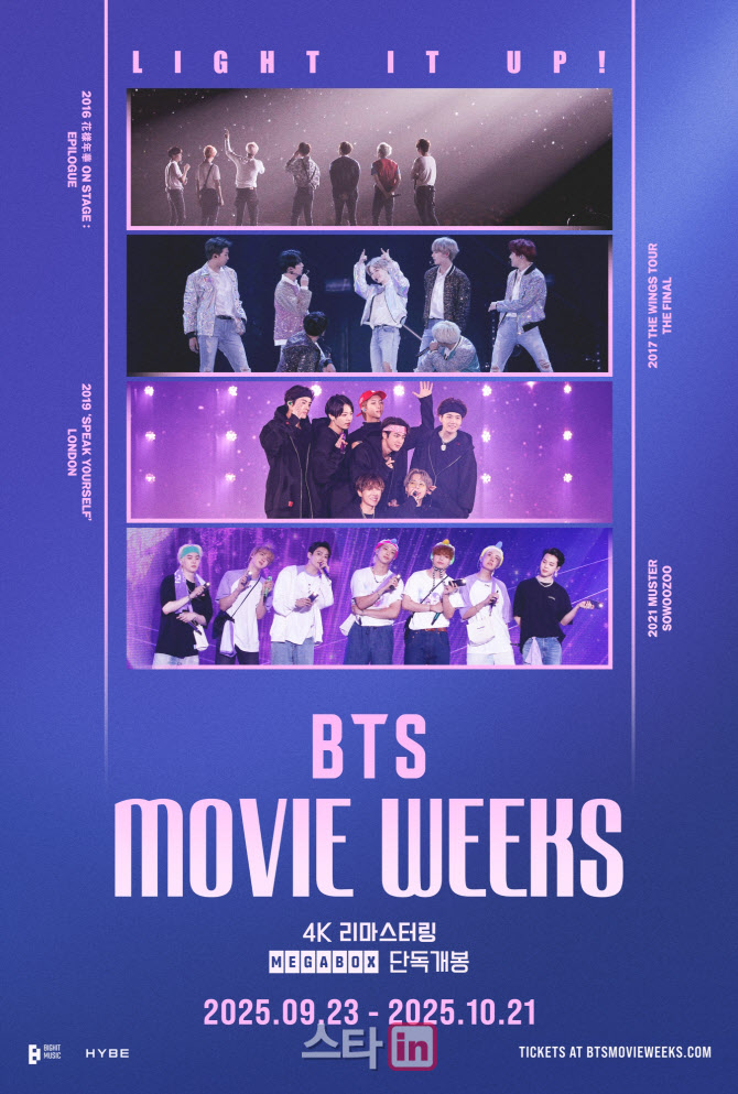 'BTS무비위크스'한달간진행케이스포돔첫공연실황등담아[이데일리스타in김현식기자]그룹방탄소년단(BTS)이콘서트실황극장상영이벤트‘BTS무비위크스’로글로벌팬들과만났다.22일소속사빅히트뮤직에따르면이번이벤트는약한달간한국,미국,멕시코,영국등전세계83개국2700여개극장에서진행됐다.모든회차가‘싱어롱상영회’로펼쳐져현장을찾은팬들이응원봉을흔들며영상을즐겼다.빅히트뮤직은“전세계‘아미’(ARMY,팬덤명)의뜨거운관심속에총누적관객수가94만명으로집계됐다”고전했다.방탄소년단은‘BTS무비위크스’를통해케이스포돔첫공연,빌보드뮤직어워즈수상후글로벌아티스트로도약하던시기인2017년공연,한국가수최초로영국웸블리스타디움에서펼친단독공연,데뷔8주년을기념해진행한온라인팬미팅등4개의공연을한데엮어선보였다.일본에서는11월중순까지상영이이어질예정이다.빅히트뮤직은“상영작들을4K초고화질과5.1입체음향으로리마스터링해관객들이공연장의열기와감동을생생하게체험할수있도록했다”고전했다.한편방탄소년단은내년봄발매를목표로새앨범작업을진행하고있다.이들은앨범발매후대규모월드투어를전개할계획이다.김현식([email protected])Copyright©이데일리.무단전재및재배포금지.