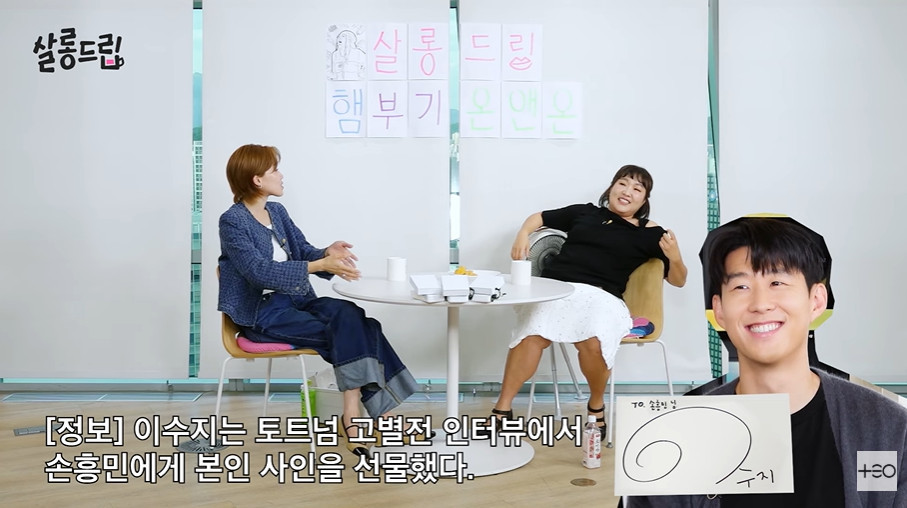 살롱드립캡처살롱드립캡처[뉴스엔장예솔기자]개그우먼이수지가손흥민을향한팬심을고백했다.10월21일공개된웹예능'살롱드립'에는이수지가게스트로출연했다.이날이수지는인기를실감한순간을묻자"예전에는스케줄을하루에2개해본적없다.근데요즘은2개할때도있고'살롱드립'처럼큰곳에나올때실감한다"고밝혔다.이수지는최근손흥민의토트넘고별전인터뷰에참석해사인을교환한바있다.당시이야기가나오자이수지는의자등받이에몸을한껏기대면서도"너무떨었다"고회상했다.이수지는"축구장에서뵀는데너무사인받고싶었다.근데이런요청이얼마나많으셨겠냐.수를써서제가먼저사인하고교환하자고했다"고털어놨다.결국유니폼에손흥민사인을받은이수지는"너무행복했다.진짜가문의영광이다.너무재밌으시다.애드리브를너무잘받아주시더라.같이콩트해보고싶다"고수줍은미소를지었다.뉴스엔장예솔imyesol@기사제보및보도자료[email protected]ⓒ뉴스엔.무단전재&재배포금지Copyright©뉴스엔.무단전재및재배포금지.