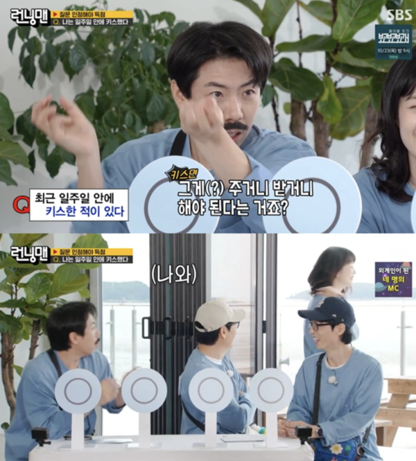 SBS‘런닝맨’캡처SBS‘런닝맨’캡처[뉴스엔장예솔기자]개그맨유재석이아내나경은과의마지막키스를떠올렸다.10월19일방송된SBS'런닝맨'은'찾으면임자,골드헌터스'레이스로꾸며진가운데전소민,양세형이출연했다.이날멤버들은모래사장에숨겨진금을찾을수있는고성능금속탐지기를걸고'인정할래?말래?'미션을진행했다.상대팀의질문공격을팀원과반수가인정해야만승점을얻는방식이다.양세형은유재석팀(유재석,지석진,양세찬,전소민)을향해"최근일주일안에키스한적이있냐"고물었다.유재석은한참을고민하더니"혹시반키도괜찮냐.하프키스다"고조심스레입을열었다."형이갔다가실패해서돌아오는게반키냐"는멤버들의조롱속유재석은"정황상아이들과있다보니까.완키를하려다가아들지호가등장하면반키로멈춘다"고주장해웃음을자아냈다.그러나김종국팀은"저희질문이완키이기때문에반키는안된다"고완강한면모를보였다.뉴스엔장예솔imyesol@기사제보및보도자료[email protected]ⓒ뉴스엔.무단전재&재배포금지Copyright©뉴스엔.무단전재및재배포금지.