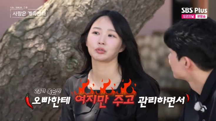 '나솔사계'16일방송SBSPlus'나솔사계'캡처(서울=뉴스1)이지현기자=24기옥순이23기옥순의행동에불만을토로했다.16일오후방송된ENA,SBSPlus예능프로그램'나는SOLO,그후사랑은계속된다(나솔사계)'에서는24기옥순이미스터한과단둘이있는자리에서23기옥순을저격하는등뒷담화했다.24기옥순이"오빠한테계속여지만주고관리했다"라며"오빠뿐만아니라다른남자들한테도그렇게하니까,11기영숙입장에서는23기옥순이빨리정리했으면(미스터한과)서로알아볼수있는거아니냐?그걸안해주니까,11기영숙입장에서는속상한거지"라고주장했다.SBSPlus'나솔사계'캡처이에미스터한이수긍했다.그가"어쨌든11기영숙을향한마음도가짜는아니었으니까,내가미안한거야.내마음이깔끔하지않은상태에서선택하고싶지않았던거야.그건예의가아니잖아"라며거들었다.미스터한이11기영숙도완전한직진은아니었다고하자,24기옥순이"오빠한테그렇게못한이유가있지"라면서재차23기옥순탓으로몰아갔다.미스터한이"그러니까나도내결정에어장관리처럼흔들리게하고싶지않은거야.교훈은여자의눈물에속지말자"라고받아쳤다.그의얘기에24기옥순이손뼉까지치며기뻐했다.이를지켜보던MC들이탄식했다.데프콘은23기옥순을향한24기옥순의질투심이라고봤다.경리,윤보미도"혼자경쟁하고있는것같다"라면서안타까워했고,데프콘이"다들되게속좁고재밌네~"라며웃었다[email protected]©뉴스1.Allrightsreserved.무단전재및재배포,AI학습이용금지.