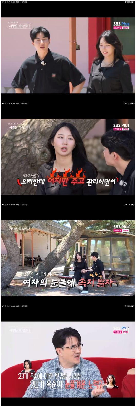 '나솔사계'16일방송SBSPlus'나솔사계'캡처(서울=뉴스1)이지현기자=23기옥순이주위에서벌어지는일들에당황했다.16일오후방송된ENA,SBSPlus예능프로그램'나는SOLO,그후사랑은계속된다(나솔사계)'에서는남녀출연진이나란히선가운데미스터한이23기옥순을저격하는'옆담화'를해긴장감을자아냈다.미스터한이24기옥순등다른여자출연진에게"(23기옥순에게)'왜그랬니,너?나한테왜그랬니?그러는거아니었어'해야하나"라며뼈있는농담을던졌다.이때다른한쪽에서는11기영숙이23기순자에게미스터한이어떤얘기를했는지물으면서궁금해했다.SBSPlus'나솔사계'캡처결국11기영숙이참고참던눈물을터트렸고,옆에서있던23기옥순이깜짝놀라며당황했다.11기영숙과조용히대화하던23기순자가그를위로했다.11기영숙이"통쾌할줄알았다.'빨리(23기옥순한테)차이고나한테와라,놀리게'생각했는데,(미스터한이)저런모습보니까"라면서시간을되돌리고싶다고속마음을털어놨다.이를지켜보던MC들이안타깝다는반응을보였다.데프콘은"(11기영숙마음은)'바보,나한테오지,내가잘해줄수있는데'그런거아니냐?"라며"이게23기옥순잘못은아니다"라는반응을보였고,경리와윤보미도공감했다[email protected]©뉴스1.Allrightsreserved.무단전재및재배포,AI학습이용금지.