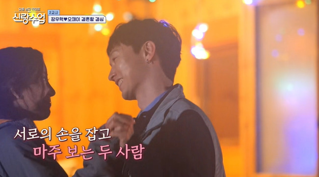 사진=채널A‘요즘남자라이프-신랑수업’캡처사진=채널A‘요즘남자라이프-신랑수업’캡처사진=채널A‘요즘남자라이프-신랑수업’캡처[뉴스엔이하나기자]오채이가기습뽀뽀로장우혁에게자신의마음을표현했다.10월15일방송된채널A‘요즘남자라이프-신랑수업’에서는장우혁과오채이의강원도평창여행이공개됐다.두사람은신혼부부같은모습으로차를타고평창으로이동했다.운전하던장우혁은오채이가직접휴게소간식을먹여주자“식어도맛있어”라고즐거워했다.오채이가“여행안좋아한다고했는데나랑오니까어때?”라고묻자,장우혁은“채이랑오는건좋다.채이가원하면매일갈수있어”라고답해오채이를감동케했다.두사람은강원도평창의한목장을방문했다.트랙터마차를타고정상으로향하던중장우혁은“어때이런데이트?약간유치해?”라고물었다.오채이는“근데나는데이트는조금유치할필요가있다고생각해.연인끼리만할수있잖아”라고말했다.해발1,100미터하늘전망대에도착한두사람은하트포즈와함께대형의자조형물에서커플사진을촬영했다.사진을찍고이동중오채이가울퉁불퉁한길에비틀거리자,장우혁은“위험하니까꽉잡아”라며자신의팔을내어줬다.양먹이주기체험후두사람은바깥에서우유아이크스림,요거트를먹던중웨딩촬영하는커플들을발견했다.장우혁은“우린(웨딩촬영)운명인가봐.저번에도웨딩촬영하던데.웨딩촬영하는데만가네우리가.여기와서하면되겠다”라고결혼플러팅을했다.오채이가못알아들은척“뭘해?”라고묻자,장우혁은“웨딩촬영”이라고말했다.두사람은글램핑장에서먹을저녁식재료를사러함께마트에갔다.장우혁은“이렇게오니까신혼부부같다”라고설렘을느꼈다.“오늘은제가맛있는걸만들어드리겠다”라고자신있게나선오채이는구매리스트를미리적어오는가하면꼼꼼하게가격과품질을비교하며장을봤다.장우혁은살림꾼같은오채이의모습에다시한번반했다.함께고기를고르던중마트직원은“(오채이가)꼼꼼한스타일이라(살림)잘하시겠다.꽉잡아라”고응원했다.이에장우혁은“잘안잡힌다”라고귀엽게반응했다.계산대직원도“너무잘어울리신다.신혼부부같다”라고두사람을응원했다.숲속글램핑장에도착한두사람은서둘러저녁식사를준비했다.오채이가재료를손질하고요리하는동안장우혁은센스있게보조역할을했다.그사이장우혁은장작패기로플러팅을했고,시원하게장작을쪼개는장우혁모습에오채이는“오빠좀멋있다”라고반했다.오채이가만든음식을장우혁은폭풍먹방을했고,오채이는잘먹는장우혁모습에뿌듯해했다.장우혁은오채이에게직접구운고기를먹여주면서“여보”라고은근슬쩍애정표현을했다.오채이가“가족여행오면내가불다피우고고기도굽는다.누가날위해해주는게”라고말하자,장우혁은“내가이제앞으로해주겠다.걱정하지마라”고오채이를감동케했다.장우혁은“국물깊이가깊다.해발3,000미터되는것같다”,“완전내스타일이야이여자.아니음식”,“음식을먹는건지사랑을먹는건지모르겠다.분명히이건음식인데세상에사랑이느껴진다”라고끊임없이오채이를칭찬했다.오채이는“이래서평창을오나?우리(여행)자주다녀야겠는데?”라고말했고,장우혁은“우리?”라고단어를캐치했다.당황한오채이는“역할분담도너무잘되고.궁합이참잘맞네”라고횡설수설했고,장우혁은“궁합이요?”라고물으며장난을쳤다.오채이는“여행궁합”이라고거듭강조했다.장우혁은추위를느끼는오채이에게외투를챙겨주고,샴페인을준비하는등센스넘치는모습을보였다.그때장우혁은스피커까지꺼내“내가채이한테들려주고싶은노래가갑자기생각났다”라며들국화의‘매일그대와’를선곡해자신의마음을표현했다.장우혁의제안에함께춤추던오채이는“이노래를왜나랑같이듣고싶었어?”라고물었고,장우혁은“저가사그대로야.나의이유는”이라고돌직구로마음을표현했다.영화의한장면처럼두사람이꿀이떨어지는눈빛으로서로를바라본가운데,장우혁은“그런생각을잠깐해봤다.저노래처럼매일이런음식을해주는사람이있으면얼마나좋을까”라고고백했다.오채이도“근데나도요리하면서오빠가너무맛있게먹어주니까.누군가를위해매일요리해주고싶다.매일해주면되게행복하겠다고생각했다”라고공감했다.장우혁은자신의상징번호35와오채이의별명‘52’의미를넣어직접만든비즈반지를선물했다.첫커플링을서로교환한장우혁은작은반지를추가로공개하며“이건52아기.52가만약에아기가생긴다면아기주라고만든거야”라고말했다.장우혁이“별이쏟아진다.다채이눈같아”라고말하자,오채이는장우혁의어깨에머리를기댔고,두사람은서로기대어하늘의별을감상했다.그때장우혁을지그시바라보던오채이는장우혁의볼에뽀뽀하는돌발행동을했다.기습뽀뽀에영상을보던녹화장은아수라장이됐고,두사람을주선해준이다해는“지금너무뿌듯하다”라고기뻐했다.장우혁은우등생이라는칭찬속에“‘신랑수업’넘버투로장우혁을밀어주시고끌어주셔서정말너무감사하다.앞으로는‘신랑수업’에는제가나오지는않겠지만멀리서응원하도록하겠다”라고말했다.뉴스엔이하나bliss21@기사제보및