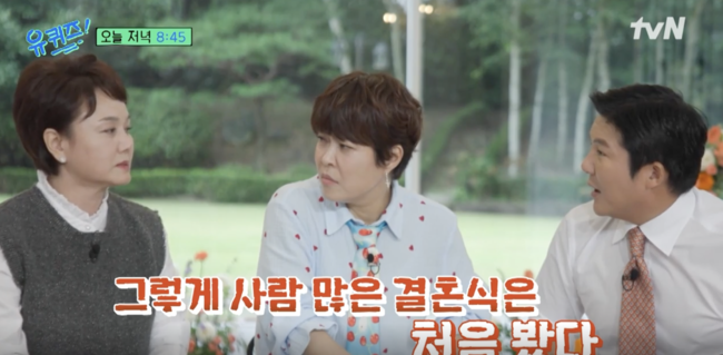 [OSEN=최이정기자]개그우먼이경실이엄청난규모의하객으로화제를모았던조세호에게소신발언을했다.15일tvN'유퀴즈온더블럭'은'드디어유퀴즈에온개그계레전드고모들!이경실&조혜련의예측불가매운맛토크대방출'이란제목의선영상을공개했다.영상에서이경실은MC조세호에게"그렇게사람많은결혼식은처음봤다"라고운을뗀후"사람이그렇게많이필요하진않아살면서"라며"단체사진을찍는데다섯파트더라"고수많은하객들로가득찼던결혼식을회상했다.이어"과연네가나중에몇명이나남을지보자"라고말했다.인생선배로서의발언.그러자조혜련은"언니왜그래"라며분위기를돌리고자했고이경실은옆에있던MC유재석의손을맞잡으며서로공감하는듯한제스처를취해웃음을자아냈다.이경실은"내가살아보니그렇더라"라고덧붙였다.유재석은이런이경실에"후배,동료들일에늘나서서얘기해주는분"이라고전했다.한편,조세호는지난해10월21일서울모처에서9살연하의모델출신신부와결혼식을올렸다.당시하객이무려900여명으로알려져놀라움을자아냈다./[email protected][사진]영상캡처Copyright©OSEN.무단전재및재배포금지.