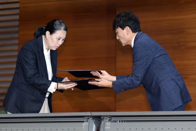 [故오요안나유족MBC공동기자회견]안형준MBC사장과단식마친유족,합의안발표제2의故오요안나사태재발방지촉구안형준MBC사장이15일오전서울시마포구상암동MBC상암사옥골든마우스홀에서직장내괴롭힘을호소하며스스로목숨을끊은MBC기상캐스터오요안나씨의어머니장연미씨와합의문에서명후교환하고있다.뉴스1안타깝게세상을떠난故오요안나가많은이들의응원끝에MBC명예사원이됐다.고인의어머니와MBC는합의문을공동으로발표하며제2의故오요안나사태재발방지를약속했다.고인의어머니는보상금등보다딸의명예회복,그리고다른프리랜서의처우개선을위해목소리를높였고변화의물꼬가트이게됐다.15일서울마포구에위치한MBC사옥에서는故오요안나유족기자회견이열렸다.이날기자회견에서MBC측은고인에대한사과,재발방지대책발표와기존기상캐스터직무정규직전환,명예사원증수여등을발표했다.안형준사장은고인의모친과공동합의서를발표하기위해단상위에올랐다.잠시추모의시간을가진안형준사장은고인을위한명예사원증을전달했고고인의어머니는세상을떠난딸을생각하며끝내오열했다.안형준사장은"먼저꽃다운나이에이른영면에든故오요안나씨의명복을빈다.헤아리기힘든슬픔속에서오랜시간을견뎌오신고인의어머님을비롯한유족께진심으로위로와사과의말씀을드린다"라면서말문을열었다.안형준사장은"다시는이런안타까운일이없어야한다는문화방송의다짐"이라면서"MBC는지난4월,상생협력담당관직제를신설해프리랜서를비롯해MBC에서일하는모든분의고충과갈등문제를전담할창구를마련했다.직장내괴롭힘과부당대우등의비위를예방하기위한교육도수시로시행하고있다.책임있는공영방송사로서,문화방송은서로존중하고배려하는조직문화,그리고더나은일터를만들어가기위해지속적으로노력하겠다"라고고개숙였다.직장내괴롭힘의혹으로지난해9월숨진전MBC기상캐스터오요안나.오요안나SNS고인의어머니는"많은분들의응원과염려,도움덕분에MBC와의교섭이합의에이르렀다.함께해주신분들에게감사하다"라면서"광장에딸의분향소에서곡기를끊고28일간단식을한것이벌써꿈같다.합의문에서명하기위해MBC에와있다는것또한실감이나지않는다.지난싸움을떠올리면제투쟁을할때의마음,지금의마음을전달드린다"라면서흐느꼈다.이어"딸은정말MBC를다니고싶어했다.하루하루열심히방송을하다가갑자기세상을떠났다.제삶의이유가사라졌고하늘이무너졌다.이문제에아무런책임을지지않는MBC에대해분노했다.뒤늦게딸이남긴흔적을통해그런선택을할수밖에없다는것을알았지만무엇을해야할지몰랐다.안나처럼많은고통을받고있는프리랜서,방송비정규직문제를해결하기위한이들이있다는것을알게됐다.저는결론이어떻게되든좀더싸워봐야겠다는생각을했다"라면서농성을시작하던당시를떠올렸다.그러면서"자체조사와노동부감독이후여전히책임지지않는회사앞에서단식하겠다는마음을먹은날이생각난다.딸에게부끄럽지않은엄마가되겠다는마음으로곡기를끊었다.제협상안은딸의죽음이헛되지않은요구들이라고생각한다.이싸움을하면서우리안나처럼정말힘들게일하며고통받는젊은이가많다는것을알게됐다.단순히개인의싸움이아니다.우리딸을죽음으로몰고간직장내괴롭힘역시구조적문제다.그래서제2의오요안나를막고자했다.기상캐스터폐지안이어떻게실현될지꼭지켜보겠다"라면서목소리를높였다.아울러고인의어머니는"재발방지대책은방송사전체에미칠영향이엄청나다는걸안다.억울한죽음이후투쟁을거치며얻은결과는알맹이없는것으로마쳐선안된다.저도하늘에있는딸과함께MBC의노력을지켜보려한다"라고호소했다.이어진질의응답에서MBC관계자는"앞으로MBC뉴스에서날씨와관련된보도는기상기후전문가가맡을것"이라며"현재기상캐스터들은계약기간까지근무할것이며이들의처우를성실히협의할것"이라고밝혔다.합의있기전까지MBC는제도적개선에대한고민이있었다며프리랜서까지도울수있는상생담당협력관신설을예시로들었다.직장내괴롭힘을호소하며숨진기상캐스터고(故)오요안나씨의어머니장연미씨와안형준MBC사장이합의문에서명하고있다.강예진기자故오요안나는2024년9월15일세상을떠났다.향년28세.당시고인의부고소식이사망3개월뒤인지난해12월에알려지면서많은이들을더욱안타깝게만들었다.1996년생인故오요안나는JYP엔터테인먼트공채오디션에합격해아이돌연습생을준비하던중MBC기상캐스터에합격했다.2022년방송된tvN'유퀴즈온더블럭'에출연하기도했다.그러나지난해뒤늦게고인의사망소식이전해졌고이후고인이생전직장내괴롭힘을당했다는의혹이불거졌다.고인의휴대전화메모장에서발견된유서에는특정기상캐스터2명에게괴롭힘을당했다는내용이담긴것으로전해졌다.이에유족은서울중앙지방법원에가해자로지목된1명을상대로민사소송을제기했으며고인이소속된MBC는진상조사회원회를구성했다.고용노동부는기상캐스터는근로자에해당하지않는다면서도조직내괴롭힘이있었다고지적했다.MBC는가해자로지목된A씨와계약을해지했다.고인의어머니는지난달서울마포구에위치한MBC사옥앞에서문제해결을위한단식논성