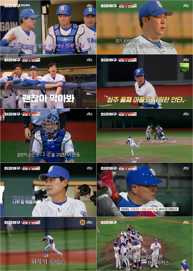 JTBC‘최강야구’캡처[뉴스엔이민지기자]JTBC‘최강야구’브레이커스가원팀시너지를보여줬다.10월13일방송된‘최강야구’에서두번째선수영입전에나선브레이커스는청주야구장에서성남맥파이스와의경기를펼쳤다.경기에앞서이종범감독이이닝책임제로투수운영을하겠다고밝힌가운데,이날경기는팽팽한투수전으로전개됐다.고깃집사장님이현승이선발투수로나서브레이커스에새로영입된MZ포수김우성과첫호흡을맞췄다.“선발투수는11년만인것같다”라며긴장감을드러낸이현승은1회초무사1,2루상황에서노련한경기운영을보여주며위기를넘겼다.2회말이현승은두타자연속볼넷을주며위기를맞았다.이현승은포수김우성에게“(앞에던진)슬라이더로똑같이던질거야.친다고해서다안타아니야”라며자신을믿으라고했고,자존심을건슬라이더로스스로실점위기를벗어났다.2회까지43개의공을던진이현승은“더던져야죠.투수없는데.어차피경기끝나면일주일쉬니까”라고팀의상황까지헤아렸다.총53개의공을던진이현승은무실점으로3이닝을책임졌다.팬들에게잊혀지고싶지않은고깃집사장님이현승의각성과혼신의역투가감동을선사했다.브레이커스는1회말조용호와김태균이볼넷으로출루했고청주야구장에서첫만루홈런을쳤던4번타자최진행이2루타를치며1타점을올렸다.최진행의활약은수비에서도이어졌다.1루수로변신한최진행은중요한순간슈퍼캐치를보여주며성남맥파이스의득점기회를막았다.이현승에이어등판한문성현이공격적인피칭을앞세워4회초와5회초를무실점으로막아내며짜릿함을더했고,1점차승부가계속되는상황속6회초윤석민이마운드를이어받았다.첫경기에서전성기시절을연상케하는슬라이더와제구력으로화제를모은윤석민의투구에이목이집중됐다.그는“볼넷없는퍼펙트한이닝을만들고싶다”라고자신했다.화제였던슬라이더에이어비장의무기인‘전설의팜볼’로또한번모두를놀라게만들었다.6회말,기다리던브레이커스의추가점이나왔다.강민국의안타,조용호의볼넷에이어노수광의첫안타가터졌다.1사만루상황에서주장김태균이타석에들어섰다.추가점을낼수있을지는김태균의방망이에달린상황.모두가숨죽인가운데김태균은신중하게공을골랐고외야로타구를보내며1타점을만들어냈다.더그아웃으로돌아온김태균은이대형을끌어안으며“미치겠다미치겠어”라고속마음을드러냈다.김태균은“팀의주장,중심타자로서찬스가왔을때해결하지못해죄책감이남았다.한점이라도뽑아안도감이들었다”라고간절했던진심을고백해뭉클함을자아냈다.7회초윤석민은두타자를아웃시킨후힘이빠져제구에문제를겪었고,일순간경기장에는팽팽한긴장감이흘렀다.윤석민은“야구를오래해서타자들의제스처만봐도스윙여부를안다”라며타자의헛스윙을유도하는변화구로승부수를띄웠고2이닝무실점으로마무리해박수를절로나오게했다.이종범감독은“타자의심리를잘꿰뚫어”라며윤석민의노련함에감탄을터트렸다.8회말노수광의안타에2루에있던허도환이전력질주했고,홈플레이트로슬라이딩하며1점을추가했다.특히장성호코치의대범한주루플레이에모두가엄지를추켜세웠다.첫경기의선발투수였던오주원이9회초마무리투수로마운드에올라배포있는투구로경기를마무리했다.브레이커스는3:0으로완벽한승리를거뒀고,성남맥파이스의투수임민수를영입했다.야수를눈여겨보던이종범감독은“경기를하다보니좋은투수가눈에확들어왔다.임민수의브레이킹커브에깜짝놀랐다”라고임민수를영입한이유를밝혔다.한명재캐스터는“지난경기에서방망이가팀의승리를만들었다면오늘은투수들이승리를만들었다”라고두번째경기를평가했다.이에정민철해설위원은“고무적인부분은경기를거듭하며브레이커스선수들의현역시절모습들이나온다는것”이라며폼을찾아가는브레이커스에대한기대감을드러냈다.브레이커스는이현승,문성현,윤석민,윤희상,오주원까지5명의투수들이각자맡은이닝을책임지며빈틈없는투수연계로3:0팀영봉승을거둬짜릿함을선사했다.또한부진했던주장김태균과나지완이살아났고,최진행까지1루수비요정으로변신하며공수에서맹활약을펼쳐원팀시너지를폭발시켰다.이종범감독은“야구가인생이랑똑같다.우려했던투수들이잘해서경기를이겼다”라며“매번최선을다하는것이답”이라고전했다.이현승은“모든투수들이각성했다”라며남달랐던분위기를전했고,윤석민은“내가얼마나야구에진심인지보여주겠다고각오를다졌다.다음경기도등판하도록준비하겠다”라며자신감넘치는모습을뽐내앞으로의활약에기대를높였다.뉴스엔이민지oing@기사제보및보도자료[email protected]ⓒ뉴스엔.무단전재&재배포금지Copyright©뉴스엔.무단전재및재배포금지.