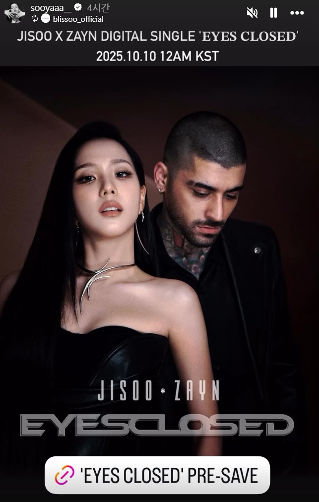 [스타뉴스|이윤정기자]*[K-EYES]는K-콘텐츠와K-컬쳐및K에브리씽을바라보는글로벌시선을소개하는코너입니다.지수와제인말리크의EYESCLOSED/사진=지수인스타그램블랙핑크지수가전원디렉션멤버제인말리크와의듀엣곡'EyesClosed'의티저비디오를9일공개했다.아울러한국시간내일오후1시에이노래를발매한다고공식발표했다.이번협업은지수에게있어첫공식남성아티스트와의콜라보레이션으로,글로벌음악팬들의이목을집중시키고있다.단계적티저공개로극대화된기대감지수는10월6일,SNS를통해수수께끼같은티저이미지를처음공개하며팬들의호기심을자극했다.그녀의등뒤로남성의그림자가어렴풋이비치고,'EYESCLOSED'라는문구가크게새겨진이미지와함께"aduetisnear(듀엣이가까워진다)"라는캡션을달아새로운콜라보레이션의가능성을시사했다.이후공개된두번째게시물에서는그림자속남성의모습이보다선명하게드러났고,"두개의목소리,하나의곡.곧발매"라는메시지로팬들의추측을더욱부채질했다.단계적으로정보를공개하는전략적마케팅은소셜미디어에서폭발적인반응을이끌어냈고,결국10월7일협업상대가제인말리크임이공식확인되며전세계음악팬들을열광시켰다.이날티저가공개된뒤중국QQ뮤직에서6만건이상의선예약을기록했고,X(구트위터)에서는수백만건의상호작용과함께전세계트렌드에올랐다.제인말리크의공식발표트윗은2,600만뷰를넘어서며,동서양을아우르는폭발적인관심을증명했다.워너레코드가공개한뮤직비디오티저역시단몇시간만에14만5천개이상의좋아요를기록하며,'EyesClosed'에대한높은관심을보여주었다.팬들은원디렉션의스타와글로벌수퍼스타지수와의깜짝협업이공개되자"내눈으로보면서도믿어지지않는비현실적듀엣"이라며열광적인지지와기대감을보였다."두사람의목소리가너무잘어울린다.지수의첫공식콜라보가제인이라니,그녀의목소리와정말잘어울리는사람을선택했다.""눈을감고'EYESCLOSE'를듣고있나요?비주얼,보컬,분위기...이콜라보의모든것이완벽함을외치고있어요.제인과지수가같이부르는노래라니...역사다"라는글로벌반응들이X를비롯한소셜미디어에쏟아졌다.두아티스트의연결고리는이미예고되어있었다.제인말리크은지난7월27일딸카이와함께블랙핑크의뉴욕공연을찾았고,공연후자신의SNS에관객석에서촬영한사진을게시하며"감사합니다.나와카이는정말즐거웠어요"라는캡션을남겼다.공개된스튜디오녹음사진에는카이가함께있었다는팬들의증언도나오기도했다.이번'EyesClosed'는지수가지난2월발매한솔로EP'Amortage'이후약8개월만의신곡이다.'Amortage'에는타이틀곡'Earthquake'를비롯해'YourLove','Hugs&Kisses'등이수록되어지수만의음악색깔을확립했다는평가를받았다.특히이번신곡에서지수는KiddoA,AlexHope,IsaiahTejada,MikkyEkko,DarkWaves,StefanJohnson,JordanKJohnson등글로벌히트메이커들과어깨를나란히하며작사진에이름을올렸다.직접작사에참여함으로써단순히노래를부르는것을넘어,자신만의이야기를음악에담아내는아티스트로서의면모를입증했다.'EyesClosed'는사랑과과거의상처를넘어서는이야기를담고있는것으로알려졌으며,K-pop의세련미와R&B의감성이조화를이룬곡으로기대를모으고있다.지수와제인말리크의EYESCLOSED/사진=지수인스타그램지수는현재블랙핑크의DeadlineWorldTour에한창참여중이다.투어는7월서울공연으로막을올렸고,8월영국런던공연을마친후잠시휴지기를가졌다.오는10월18일대만가오슝공연으로투어가재개될예정인가운데,바쁜월드투어일정속에서도새로운음악작업을병행하며왕성한활동을이어가고있다.이윤정기자[email protected]©스타뉴스&starnewskorea.com,무단전재및재배포금지