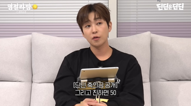 가수딘딘이연예인축의금액수에대해이야기했다./사진=유튜브영상갈무리가수딘딘이연예인축의금액수에관해이야기했다.지난7일유튜브채널'딘딘은딘딘'에는'연예인은축의금얼마할까?'라는제목의영상이게재됐다.추석을맞아라이브방송을진행한딘딘은명절선물에대해이야기하던중"전재석이형한테명절선물받는사람이다.이번추석때또저한테주소를받으셔서보내주셨다.제가재석이형한테얘기한게'이제야형의새끼가된거같다.드디어제가형님에게인정받는기분'이라했다"라며뿌듯해했다.딘딘은연예인들의축의금액수에대한이야기도허심탄회하게털어놨다.딘딘은"요즘축의금이너무올랐다"며"여러분축의금얼마하냐"고물었다.가수딘딘이연예인축의금액수에대해이야기했다./사진=유튜브영상갈무리다양한답이나온가운데한팬은"연예인들은얼마하는지궁금하다","연예인들은1000만원단위일듯"등의댓글을달았다.이에놀란딘딘은"에이1000만원을누가하냐.30만원?저는30만원,친하면50만원한다"라고솔직히고백했다.한팬이"슬리피결혼할때얼마했냐"고묻자딘딘은"솔직히정말후회한다"라고말해눈길을끌었다.딘딘은슬리피와소문난연예계절친이다.앞서딘딘은슬리피가결혼할당시냉장고와의류관리기등수백만원대의가전제품을선물로줬다고밝혀화제가됐다.이에대해딘딘은"그때제가세상물정모르고.친한사람이결혼한다하니까신나서뭘해주려고내가"라며한숨을내쉬었다.이어"냉장고해주고스타일러해주고거의700만원~800만원쓴거같다"며"그래서슬리피가계속저주한다.나결혼하지말라고"라고말해웃음을자아냈다.마아라기자[email protected]©머니투데이&mt.co.kr.무단전재및재배포,AI학습이용금지.