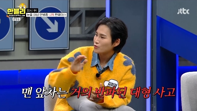 JTBC‘한블리(한문철의블랙박스리뷰)’캡처JTBC‘한블리(한문철의블랙박스리뷰)’캡처[뉴스엔서유나기자]가수김희재가교통사고목격담을전했다.10월8일방송된JTBC시사교양프로그램'한블리(한문철의블랙박스리뷰)'(이하'한블리')146회에서는트로트계아이돌김희재가게스트로출연했다.이날MC들은"희재씨가행사의왕이다.고속도로를진짜많이누비고다닐텐데에피소드있냐"고물었다.김희재는"사실감사하게도전제가사고를당해본적은없다.그런데터널안사고가난현장은목격했다.8중추돌이었다.안전거리확보를잘못해8대가쿵쿵했던걸본적있다.맨앞차는뒤가많이없어진(반파된)상태였다"고말했다.이런김희재의비오는날취미는드라이브였다."비오는날밖에서운전하는걸좋아해서집에잘안있는다"고.빗길운전이위험하지않냐는말에김희재는"비오는분위기를좋아한다.제가감성적사람이라서발라드를틀어놓고팔당댐같은곳을다녀오는걸좋아한다.비오는날은꼭밖에있는다"고밝혔다.뉴스엔서유나stranger77@기사제보및보도자료[email protected]ⓒ뉴스엔.무단전재&재배포금지Copyright©뉴스엔.무단전재및재배포금지.